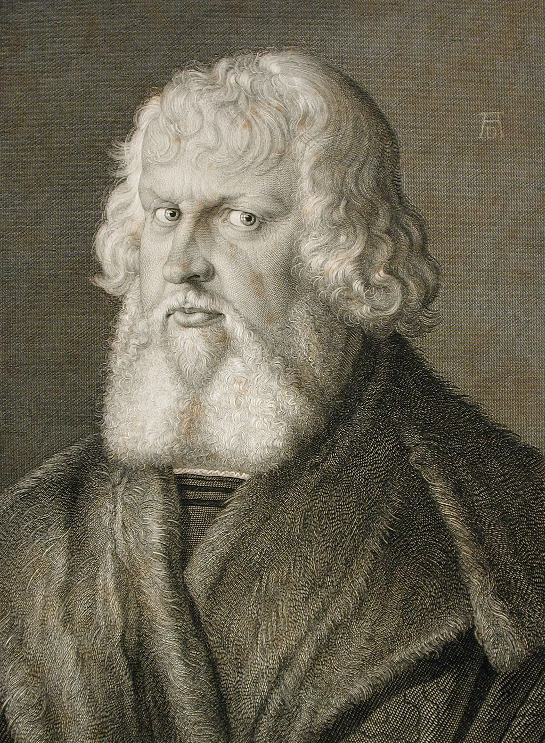 Portrait painting of an older man with curly white hair and beard, wide-set gray eyes, wearing a fur-collared garment, with a monogram in the upper right