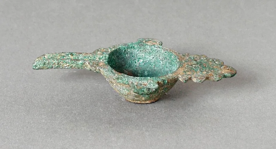 Small ancient bronze ladle or patera with thick verdigris patina, a rounded bowl, long flat handle extending left, and lobed floral attachment to the right