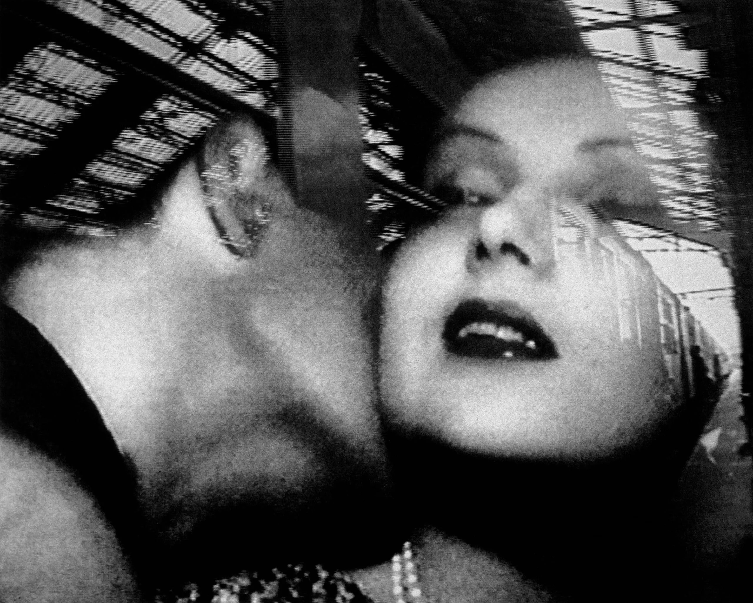 High-contrast black and white photograph with double exposure layering two figures close together over a diagonal architectural interior of a glass-and-steel ceiling