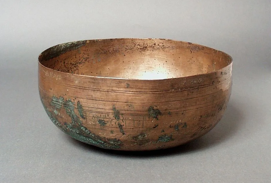 Copper bowl with hemispherical form, warm salmon-orange surface, blue-green patina on the lower exterior, and engraved horizontal lines and inscriptions around the body