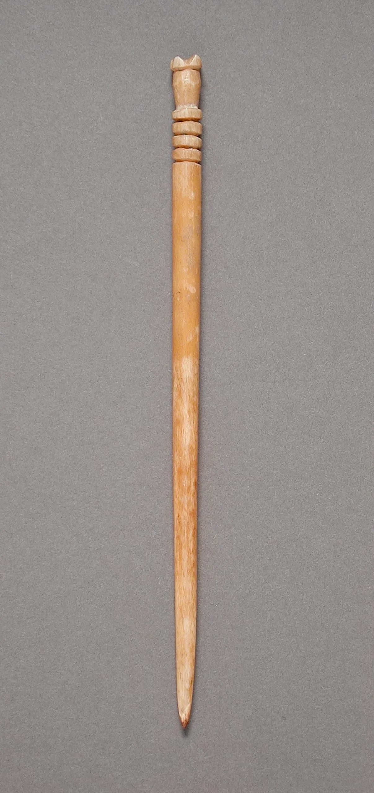 Carved bone or ivory pin with a crown-like finial and ribbed collar at the top, tapering to a sharp point at the bottom
