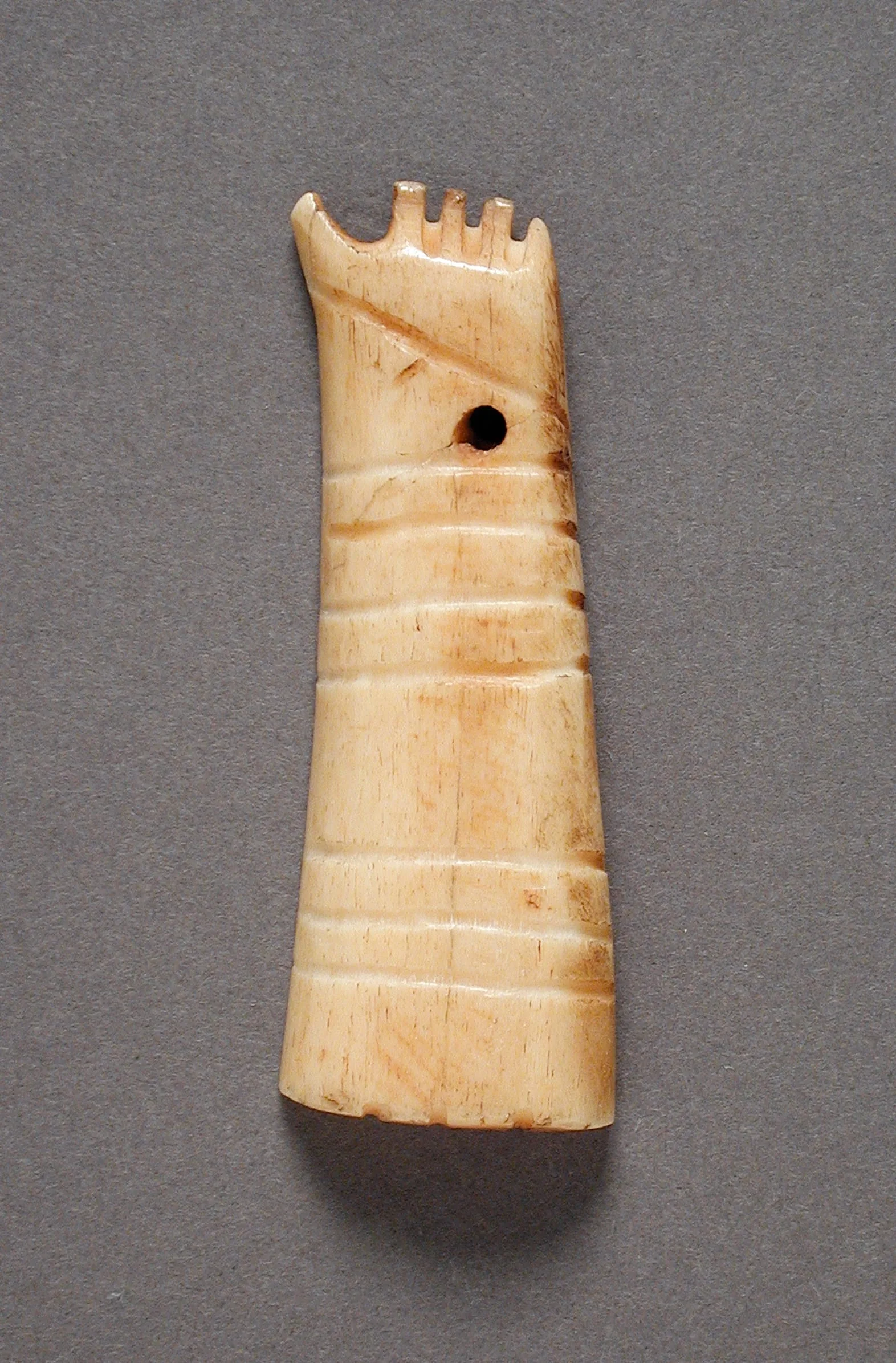 Carved bone or ivory object, vertical and slightly tapered, with a row of small prongs at the top, a drilled hole, and horizontal grooves encircling the body