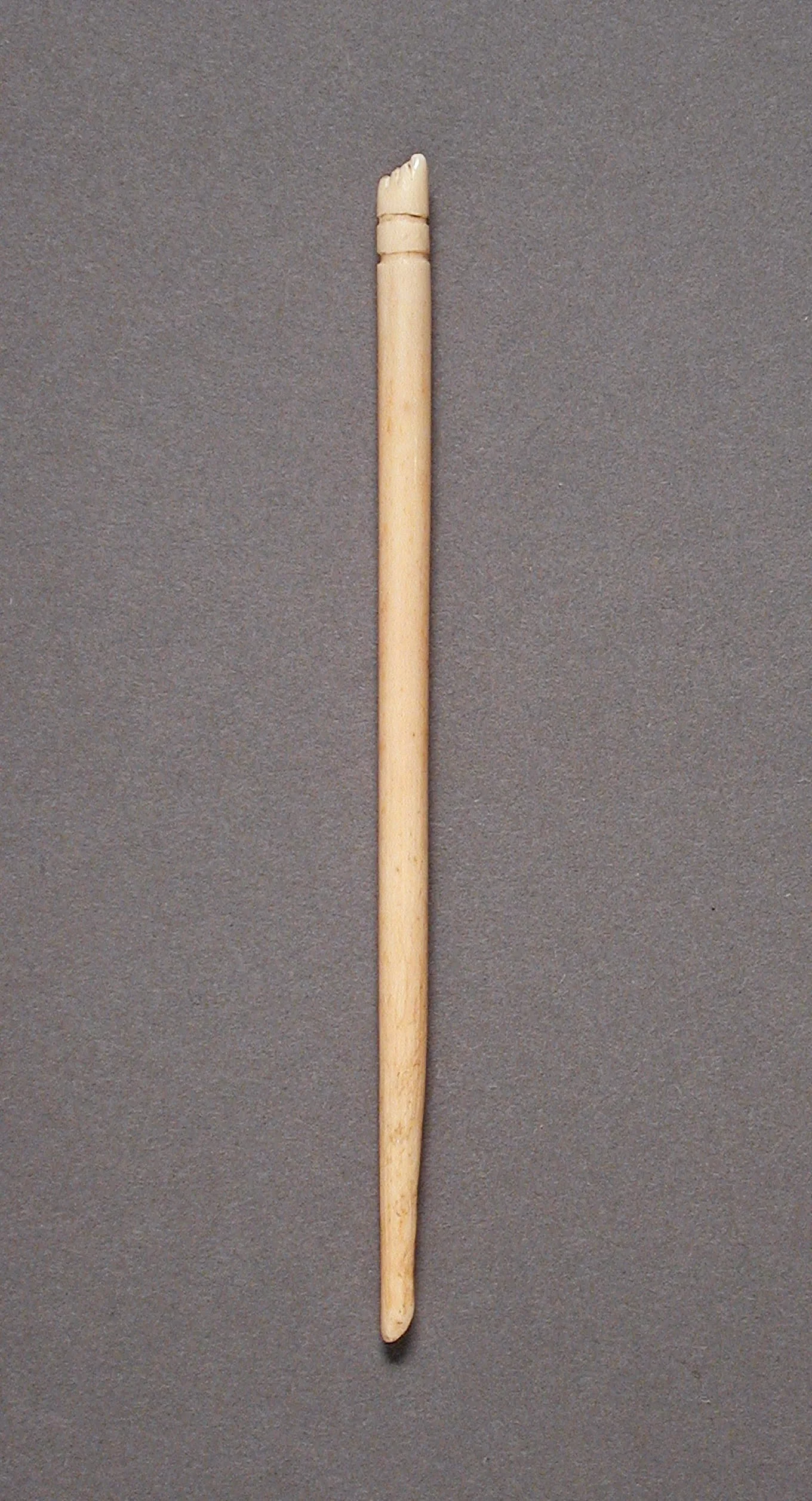 Bone or ivory pin or stylus with a smooth tapered shaft, a carved collar near the top, and a broken upper terminal, photographed against a gray background