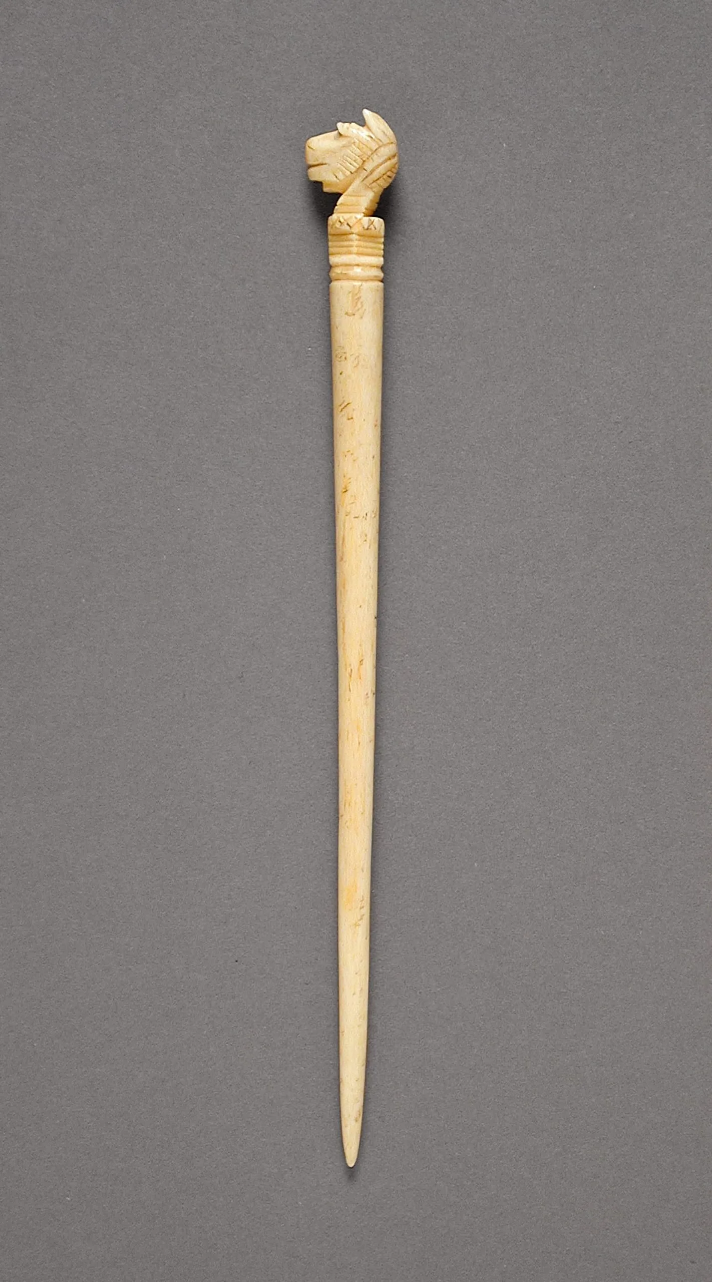 Carved ivory or bone pin with a long tapering shaft and a small animal-head finial at the top, possibly a bird or reptile with an open mouth