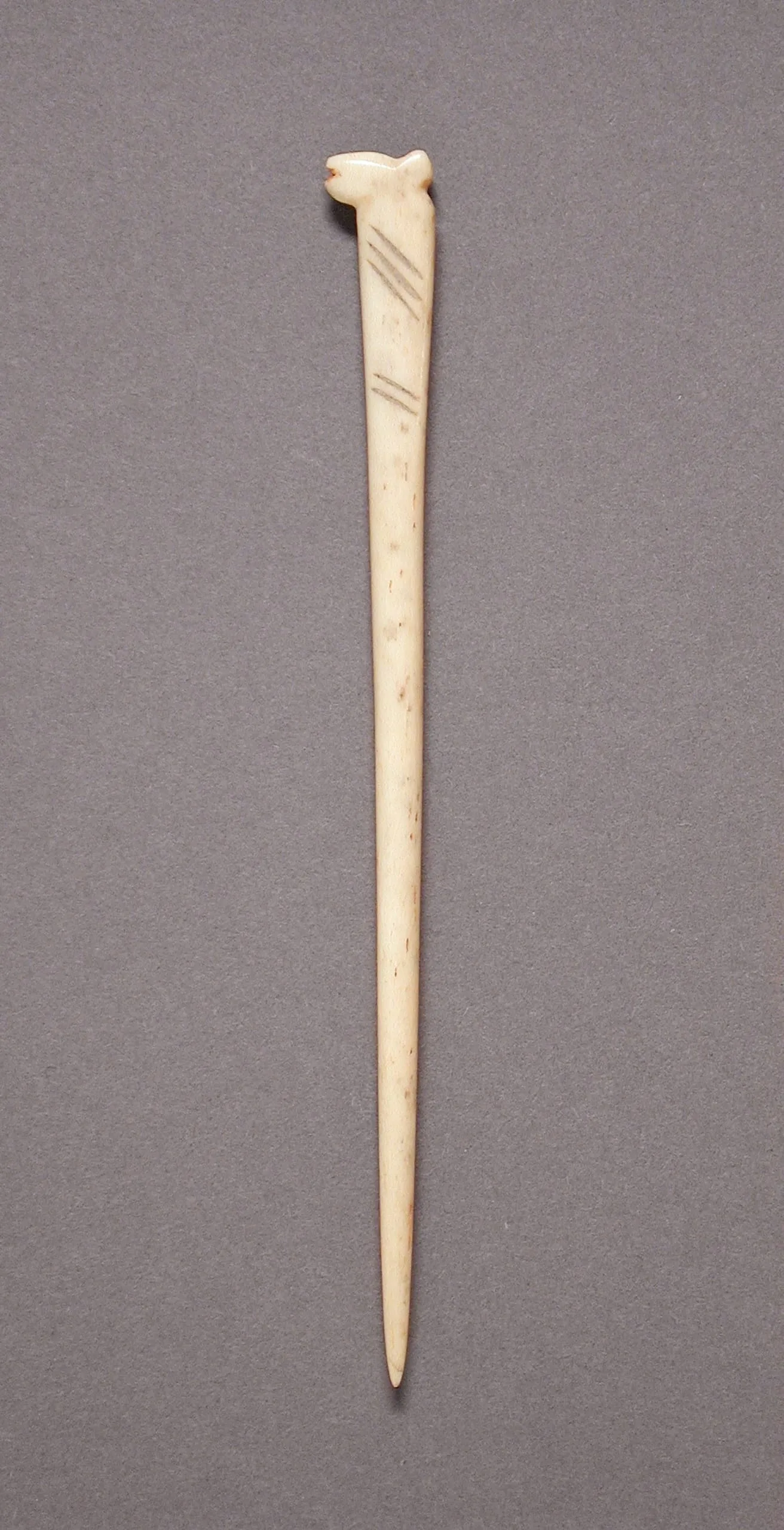 Carved ivory or bone pin with a tapered shaft, incised diagonal lines near the top, and a small animal-head finial with an open mouth