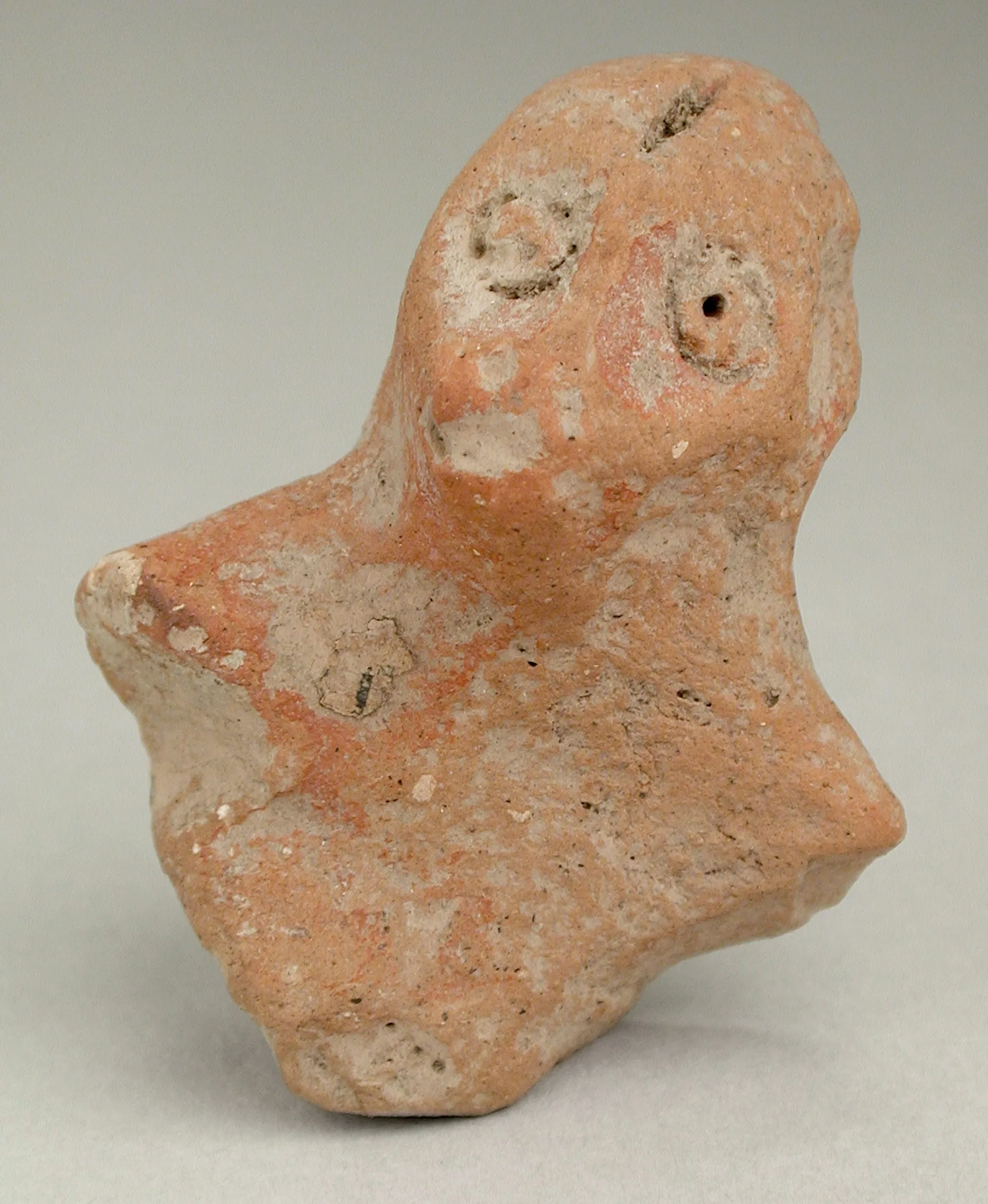 Small hand-formed terracotta figurine fragment, orange-pink clay with white mineral deposits, rounded head with punched circular eyes above a roughly broken torso