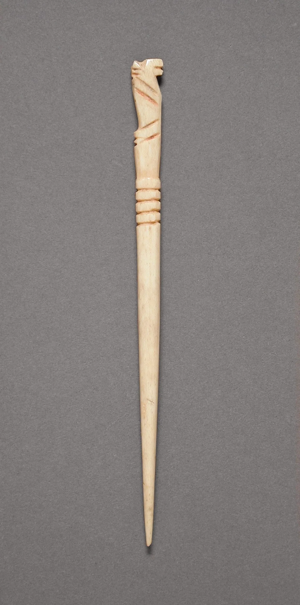 Carved ivory or bone pointed implement with a small animal-head finial at the top and three raised rings near the upper shaft