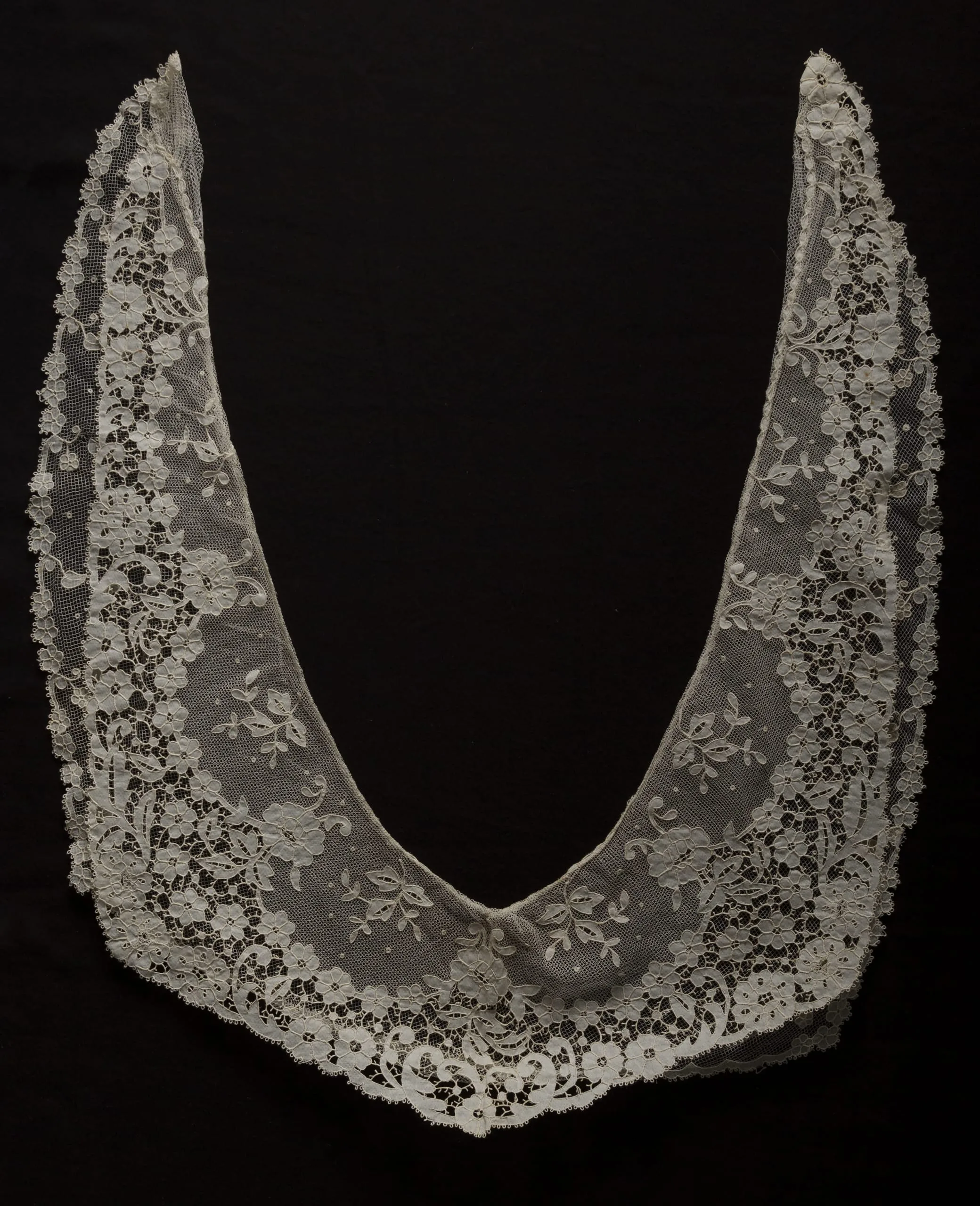 Ivory needle or bobbin lace collar displayed flat against a black background, V-shaped with dense floral and scrolling borders and a scalloped outer edge