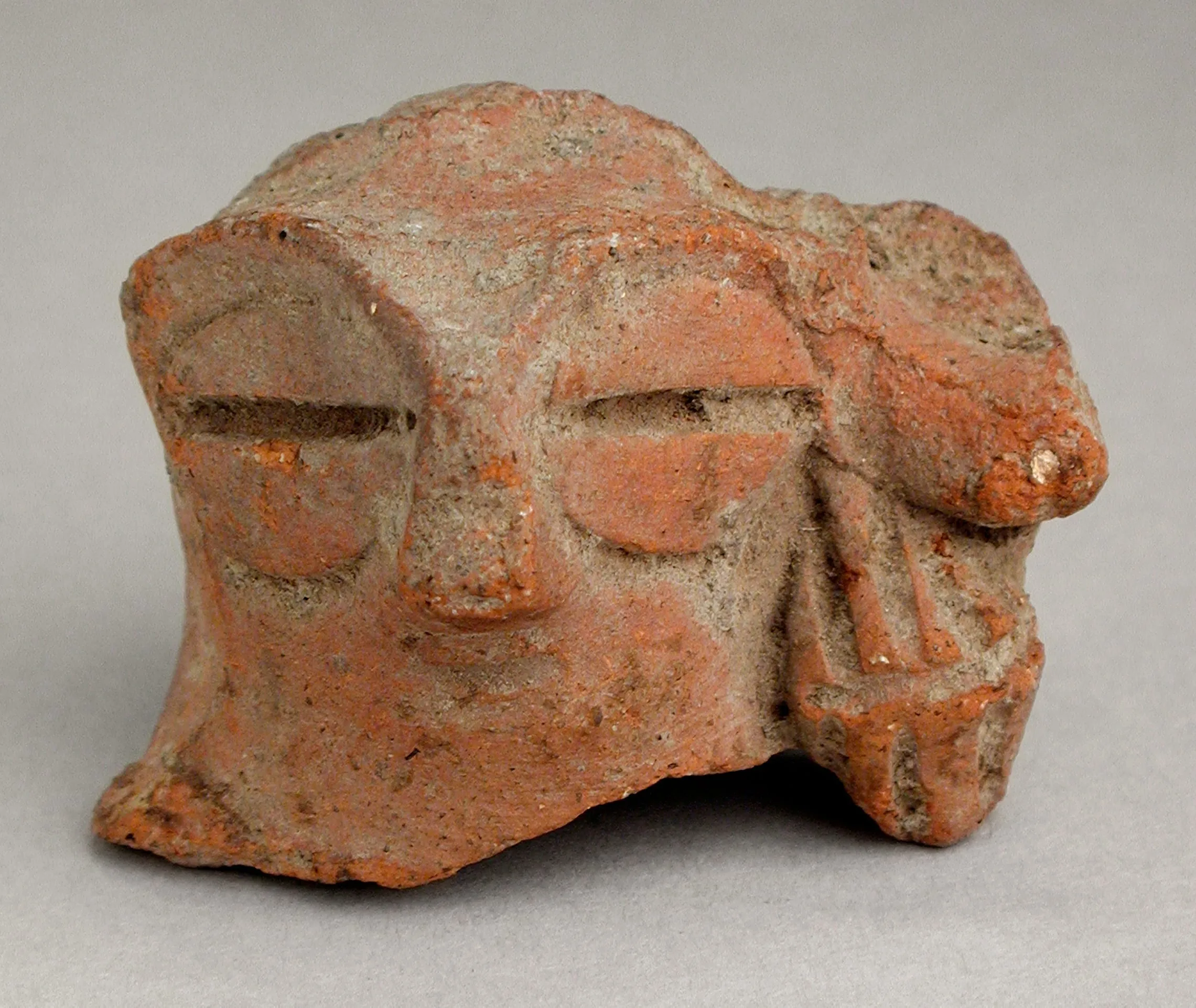 Small terra-cotta ceramic fragment depicting two human faces side by side, with slit eyes and rough, worn surface, broken at the base