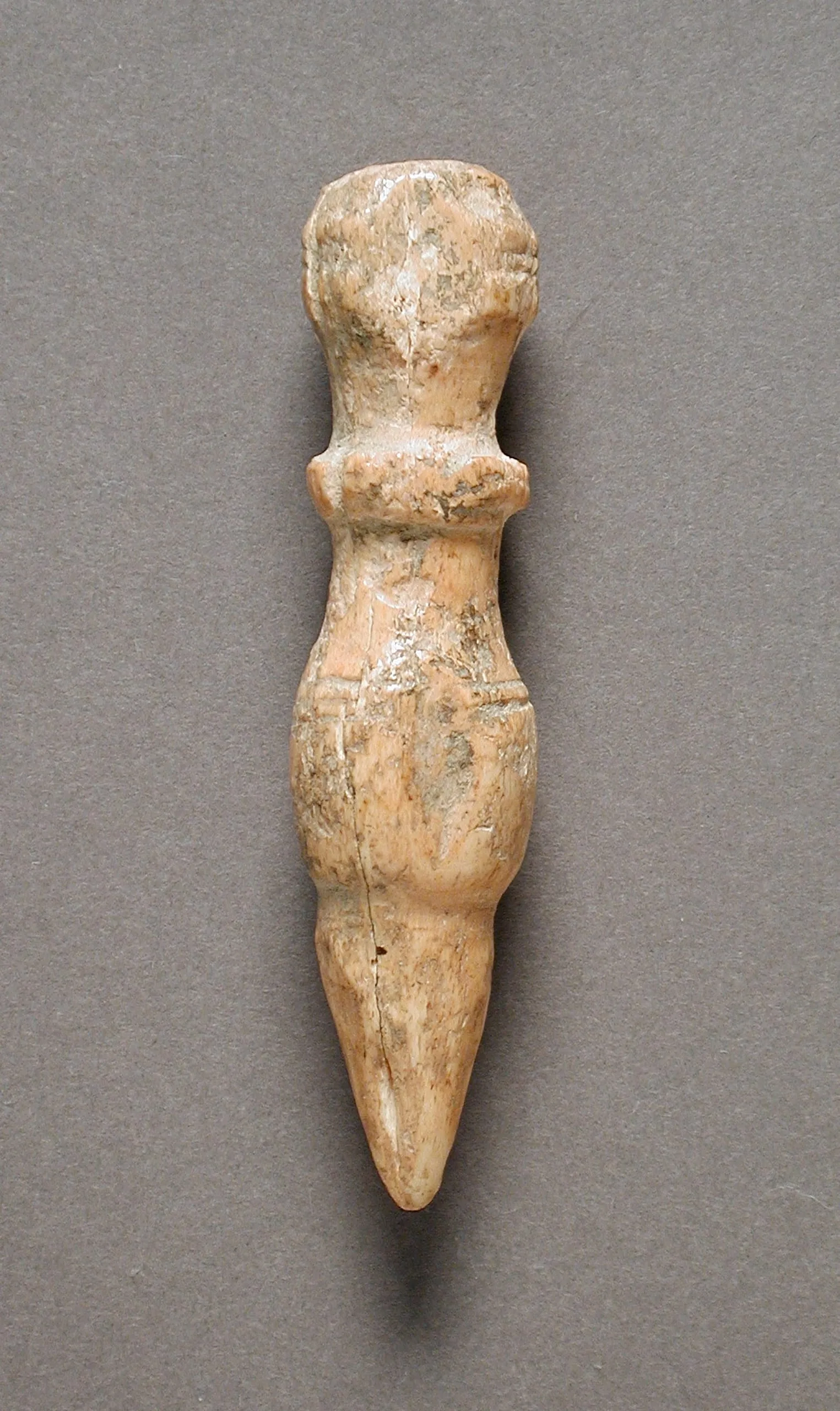 Small carved bone or ivory figurine with rounded head, pinched waist, and pointed base, with aged peanut-brown and cream surface