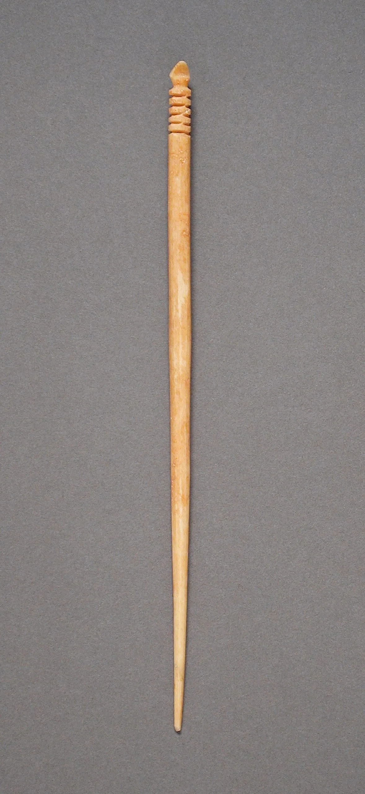 Carved bone or ivory pin with ribbed decorative band near the top, tapering to a sharp point, photographed against a gray background