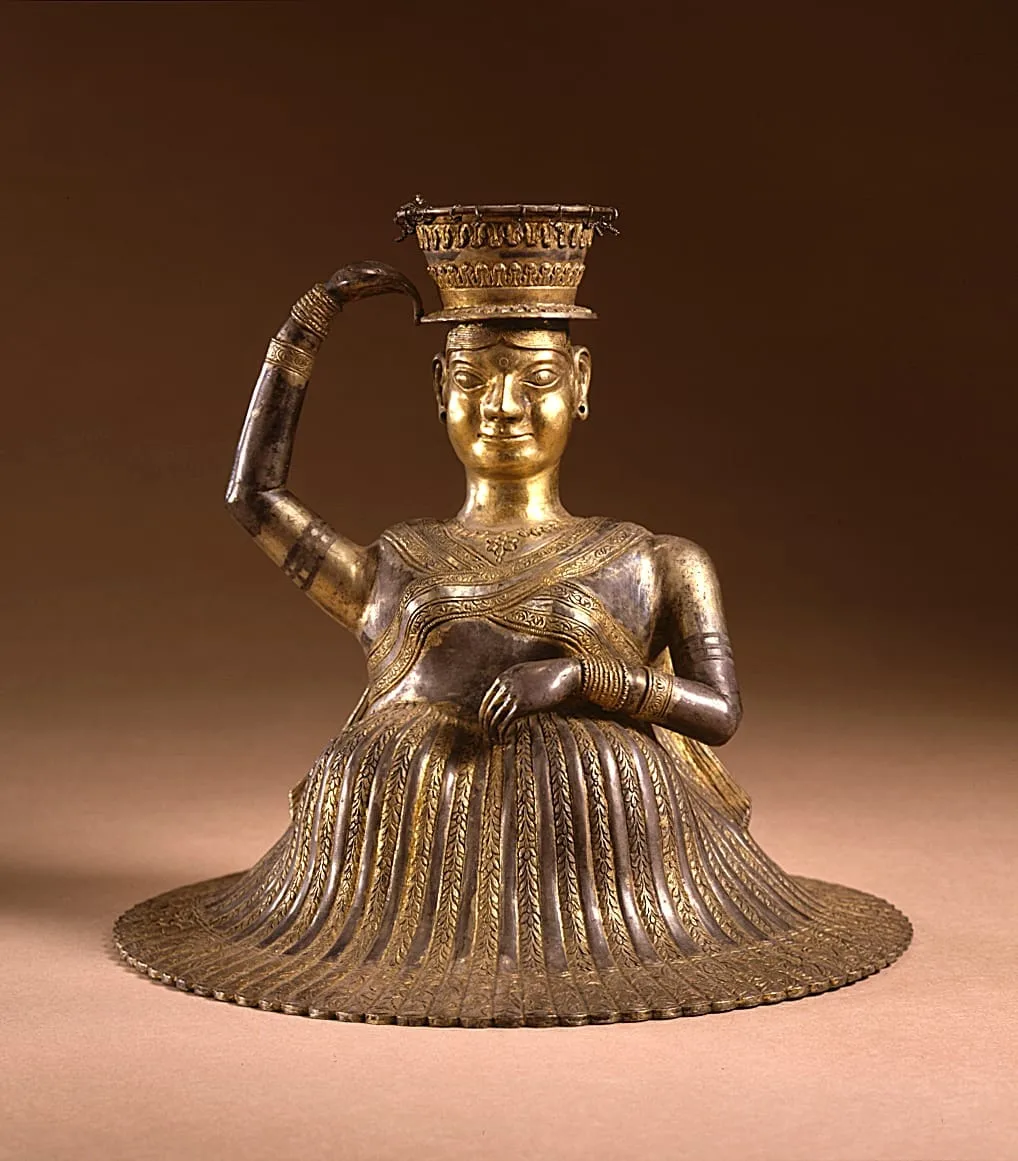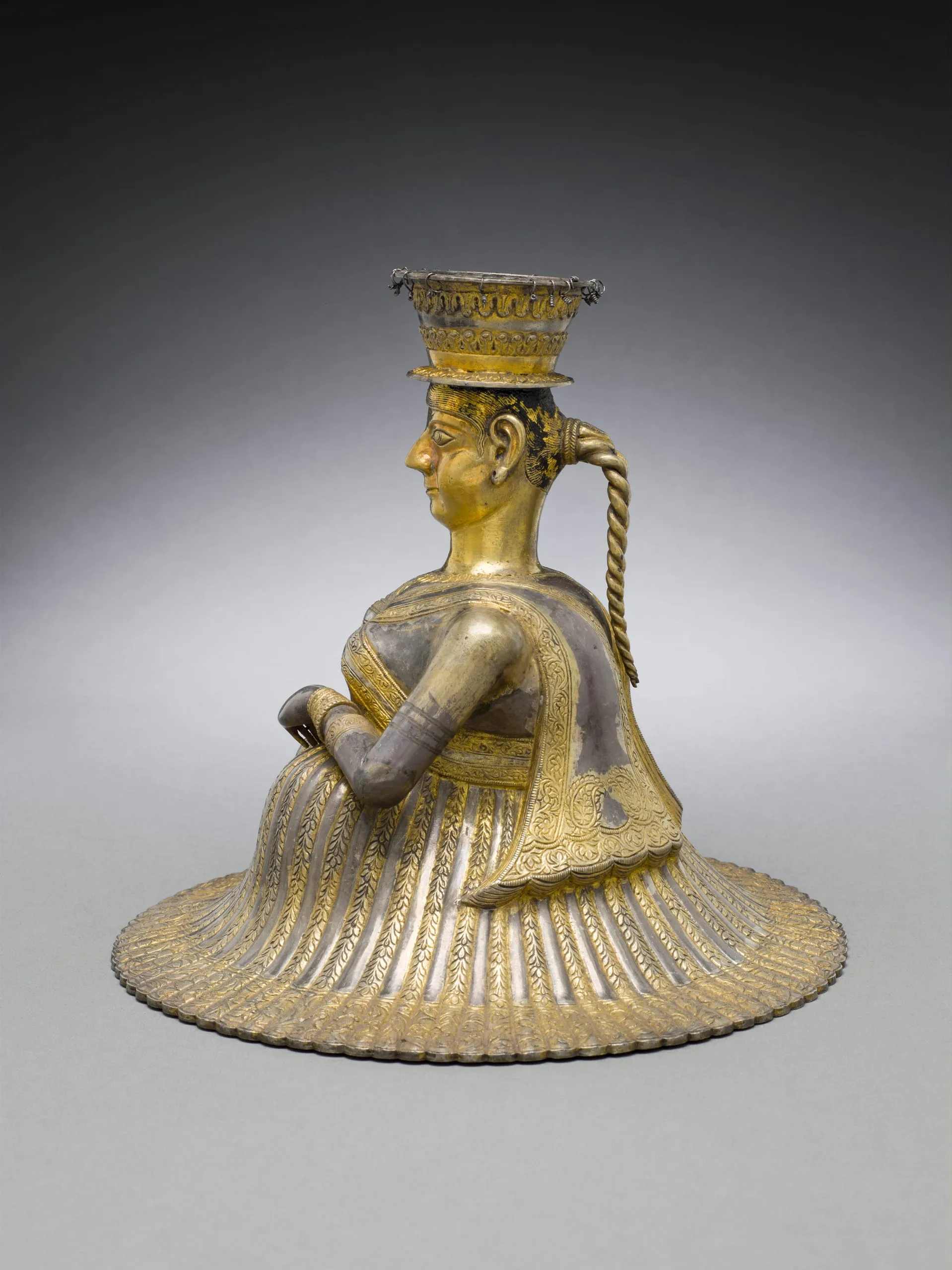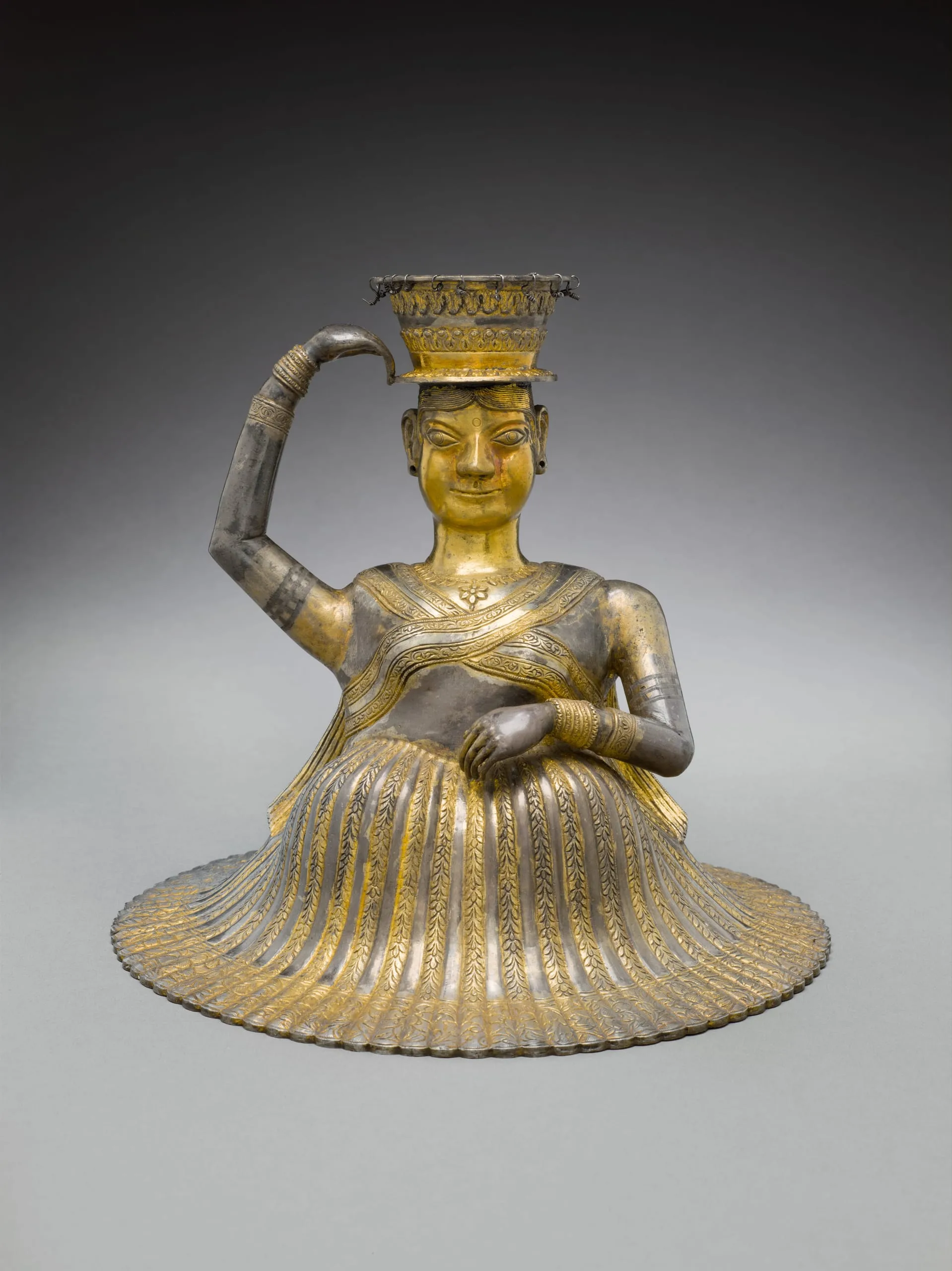 Figural hookah bases mainly appear in the contemporaneous artistic traditions of Rajasthan. A complete hookah with a similar dancer in a standing position is in the National Museum, New Delhi (61.907a-g). Paintings from the Mewar court of Maharana Jagat Singh II (r. 1734-73) occasionally depict small gilded figures beside the seated ruler that are the same approximate scale as the LACMA and New Delhi hookahs. Hence, they may represent similar figural water-pipes.