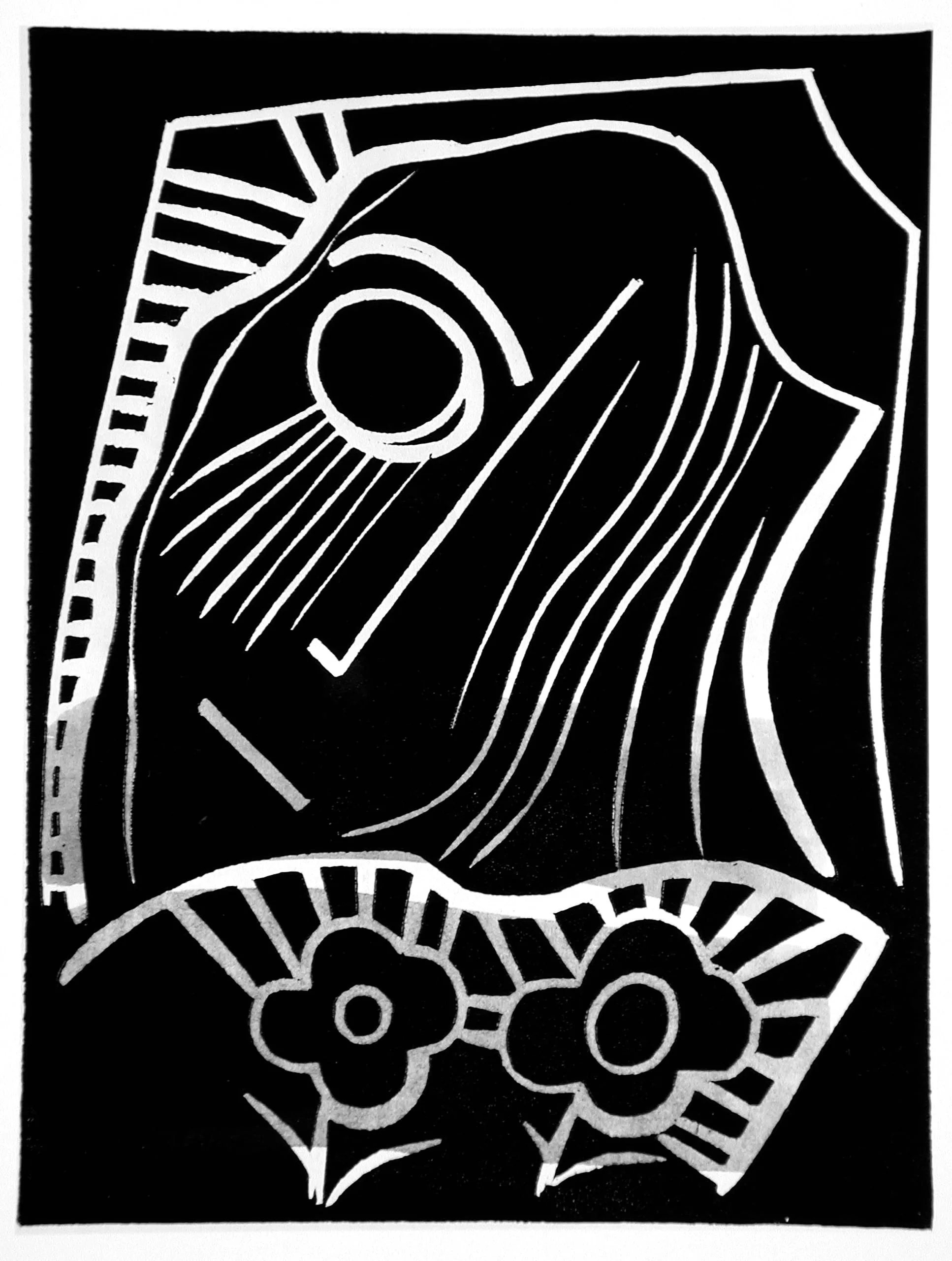 - Woodcut, handcolored in yellow, fuschia and aqua watercolor on Japan paper