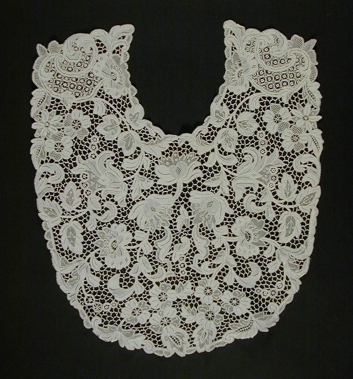 Ivory-white needle lace collar in a bib shape, densely worked with tulips, daisy-like flowers, scrolling stems, and a fine mesh ground, displayed flat on a black background