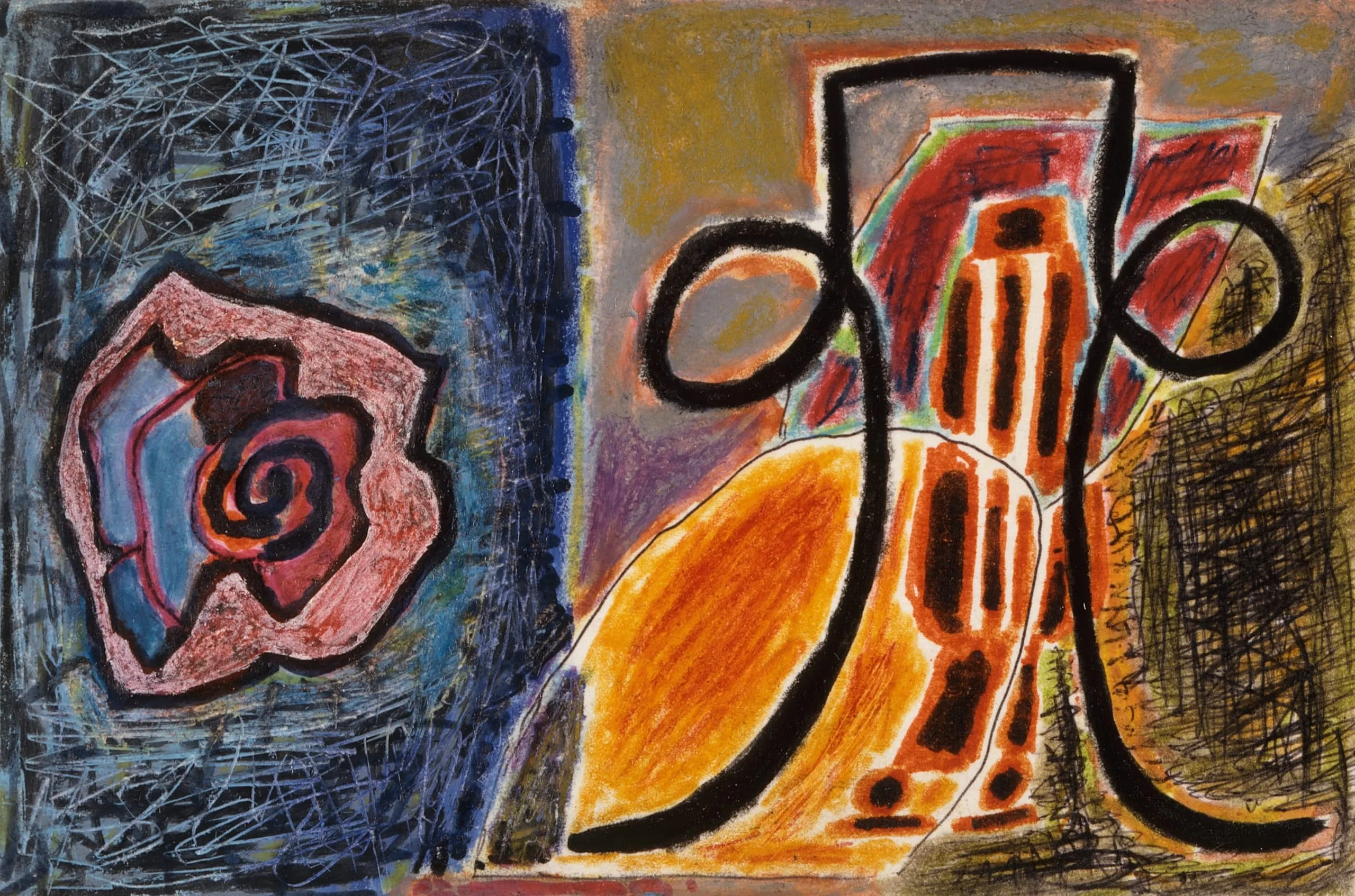 Abstract pastel or crayon work divided into a dark blue zone with a spiral rose form and a warm amber zone with a bold black-outlined vessel shape