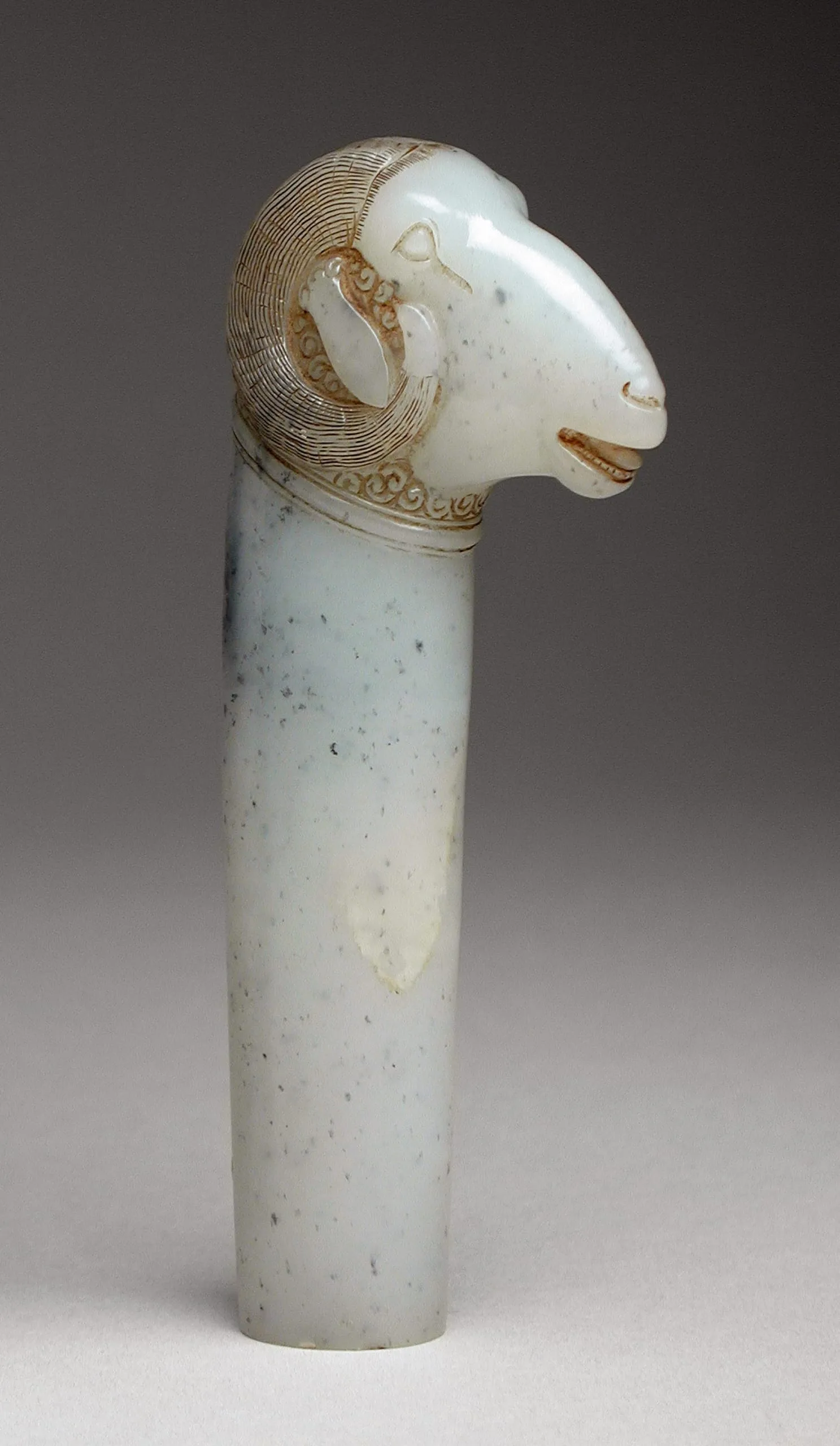 The terminal of this mottled white nephrite jade hilt is sensitively portrayed with anatomical accuracy in the form of a ram’s head. It has curled horns, pendant ears, tightly compacted swirls of hair, and a long muzzle with an open mouth revealing its tongue and teeth. The cylindrical grip tapers slightly to a perpendicular end. Given the scale and outline of the grip, it is likely the hilt was intended for use with a straight single-edged blade featured on a type of knife or dagger known generally as a kard.
