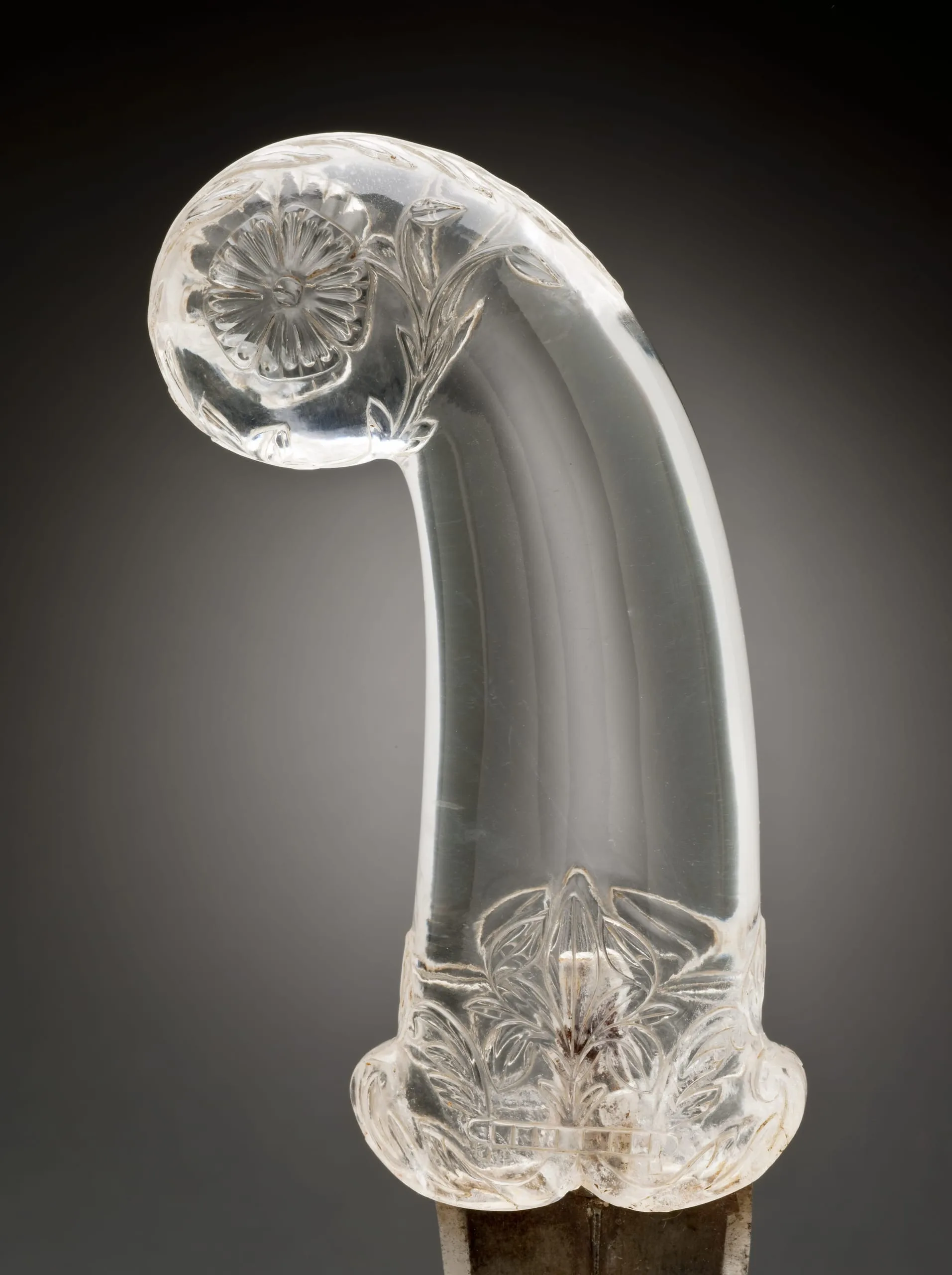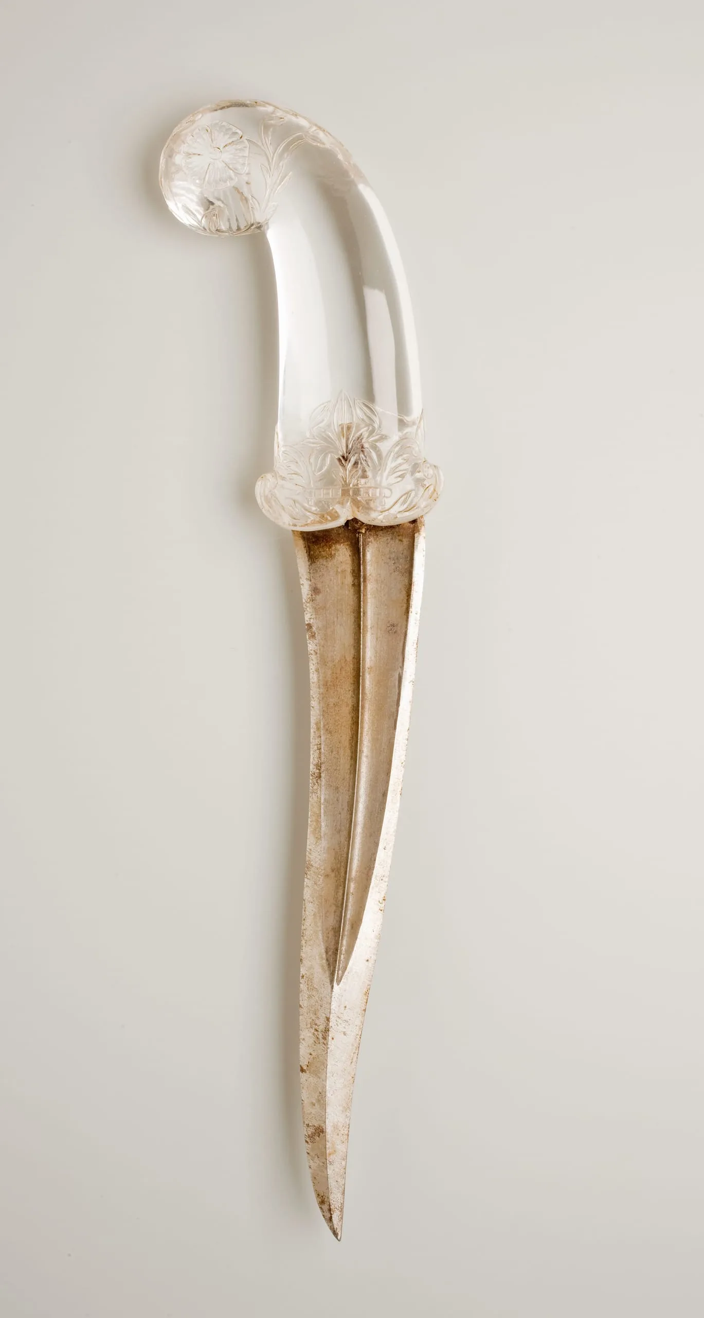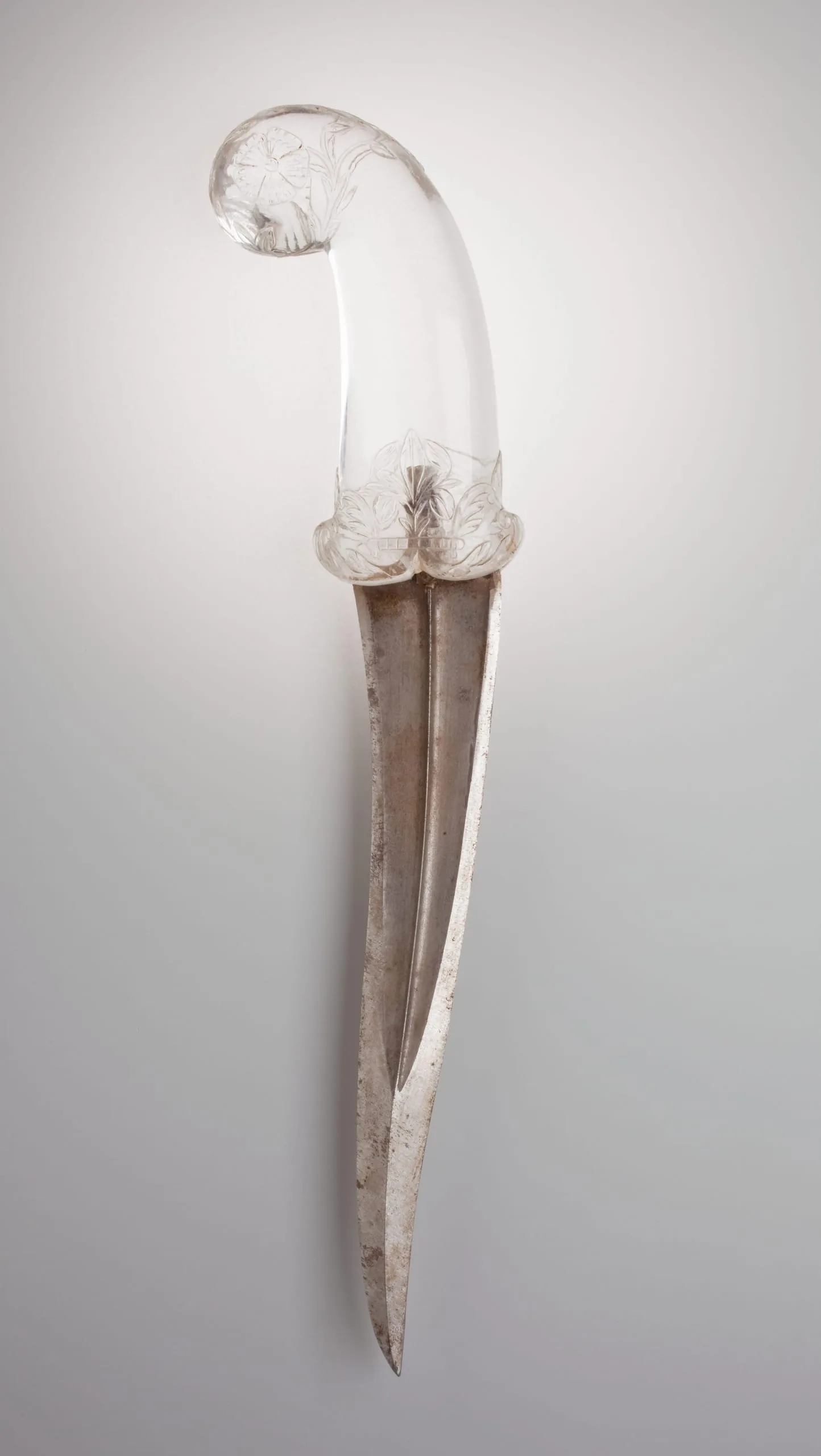 The rock crystal pistol-grip hilt of this khanjar dagger epitomizes Mughal lapidary prowess. The clear quartz imparts a somber stylishness, while the crisply rendered floral motifs enliven the surface with a lush vitality. The center of each side of the hilt butt is graced with an open dianthus flower, which rises from stalks bearing buds and pointed leaves. The foliate stalk curves around the edge of the hilt. The quillon block near the mouth of the hilt is embellished in the center with an iris flanked by split acanthus leaves. Their separate stalks rise from beneath a horizontal segmented bar that serves as a groundline. Alternatively, the bar could be read as the side edge of a tray, perhaps footed depending on one's interpretation. This visually distinctive groundline is also found in contemporaneous bidri-ware of the Deccan and Lucknow enameling, as well as in mid-17th-century palatial architecture in Amber, Rajasthan. Split acanthus leaves adorn the edges of the quillons. The double-edged blade has a tapering median ridge and a reinforced tip that recurves upward. The short tang of the blade is visible within the rock crystal. It is undetermined if the current blade is original.