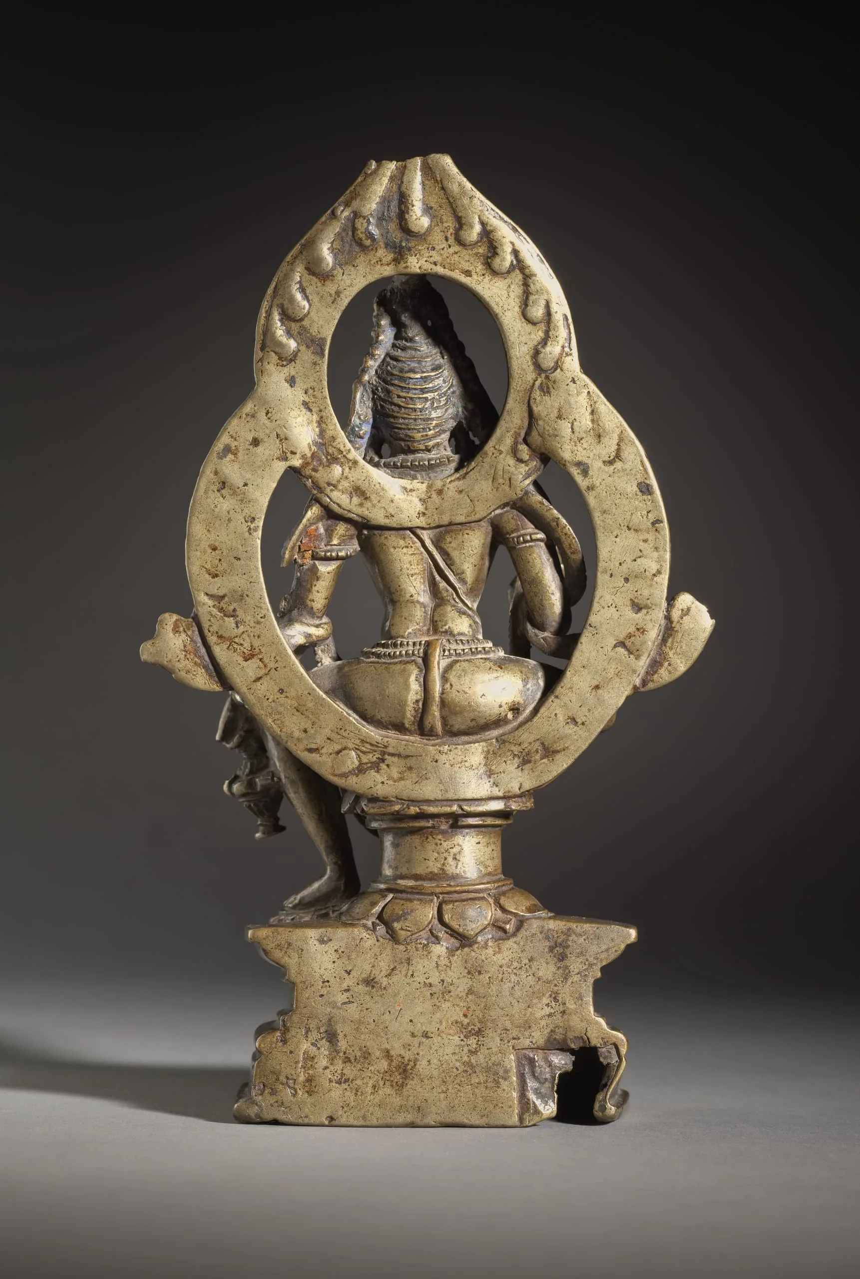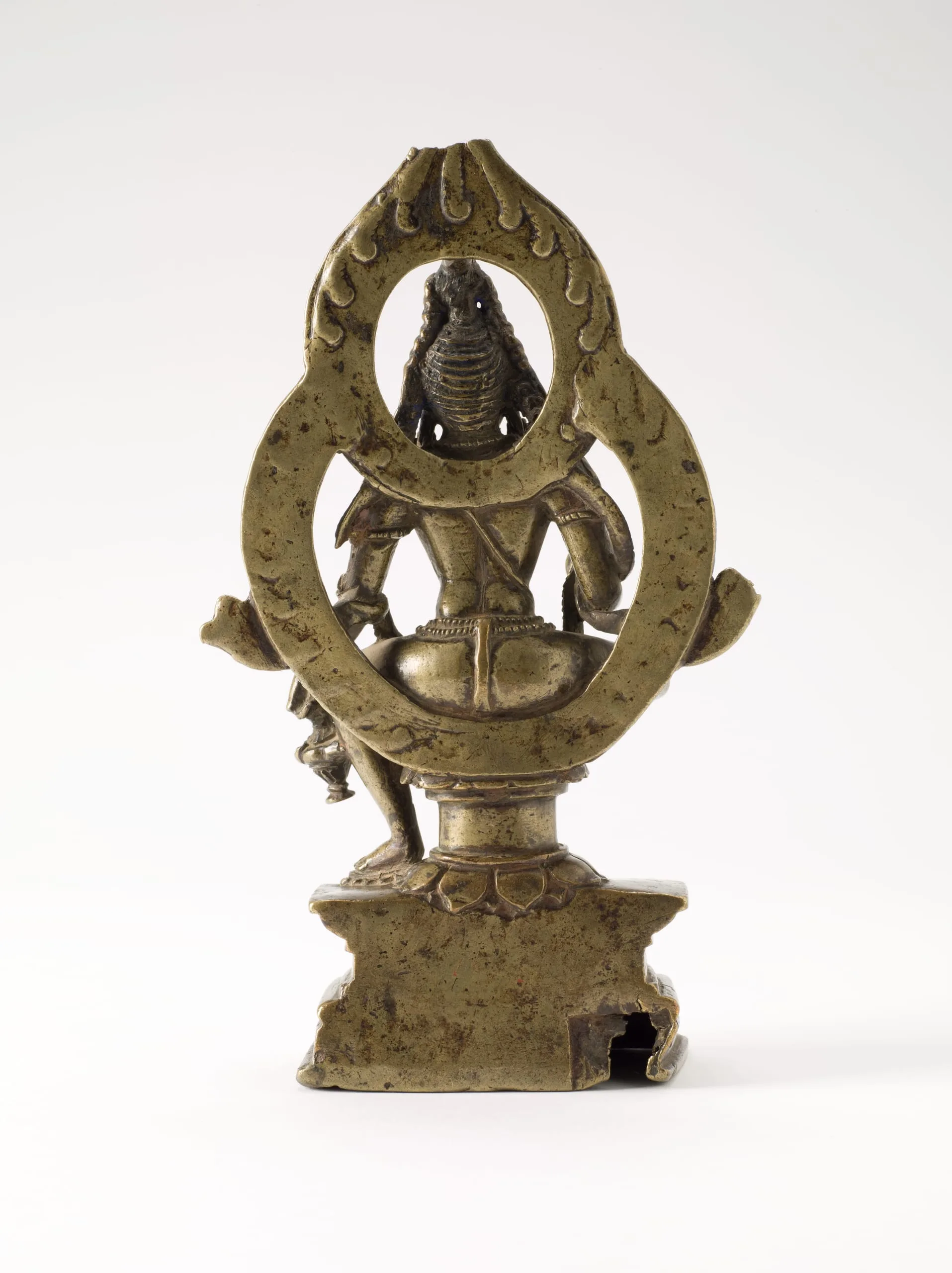 At some point, this sculpture was evidently in worship in Tibet. There are traces of blue paint in his hair and gold paint on his face, both Tibetan stylistic features. A short Tibetan inscription is also etched into the front of the base. It reads, rgya (Indian) and klad or glad (both meaning head or primary) or possibly gling referring to a (sacred) place perhaps in India. (Linrothe 2014, pp. 66 and 104, note 133)