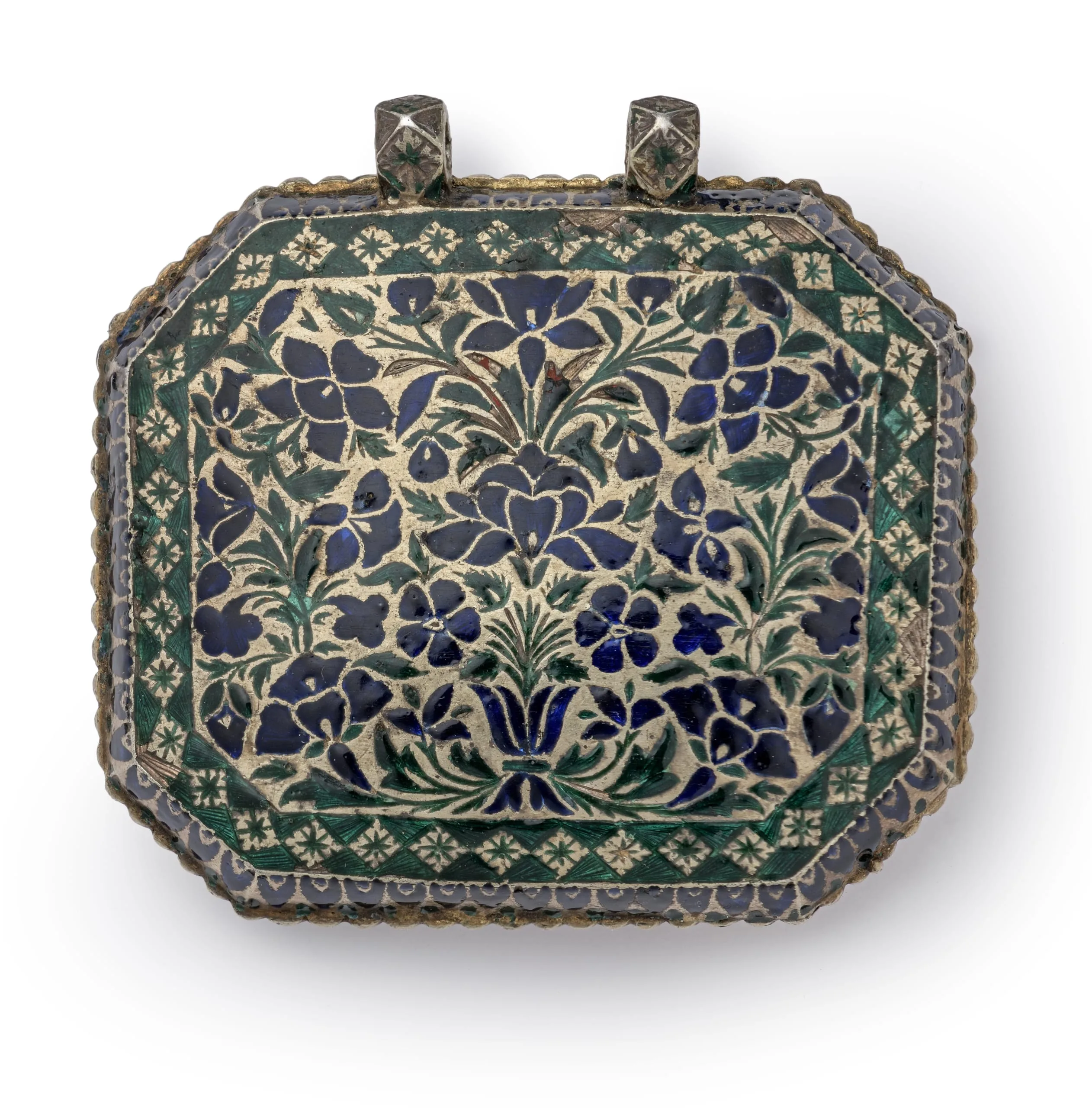 The reverse, or bottom compartment, is gilded silver with an elaborate floral design in translucent dark blue and green enamel of a poppy-like tripartite flowering plant rising from a stylized vase with a splayed foliate foot. The strong verticality of the design and its prominent center motif parallels the flowering tree used to adorn a type of protective jade amulet known as a haldili (Arabic: condition; Persian: heart), which was worn for its ostensible protection against heart palpitations.