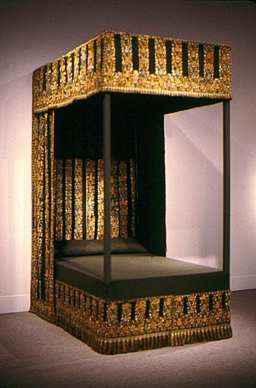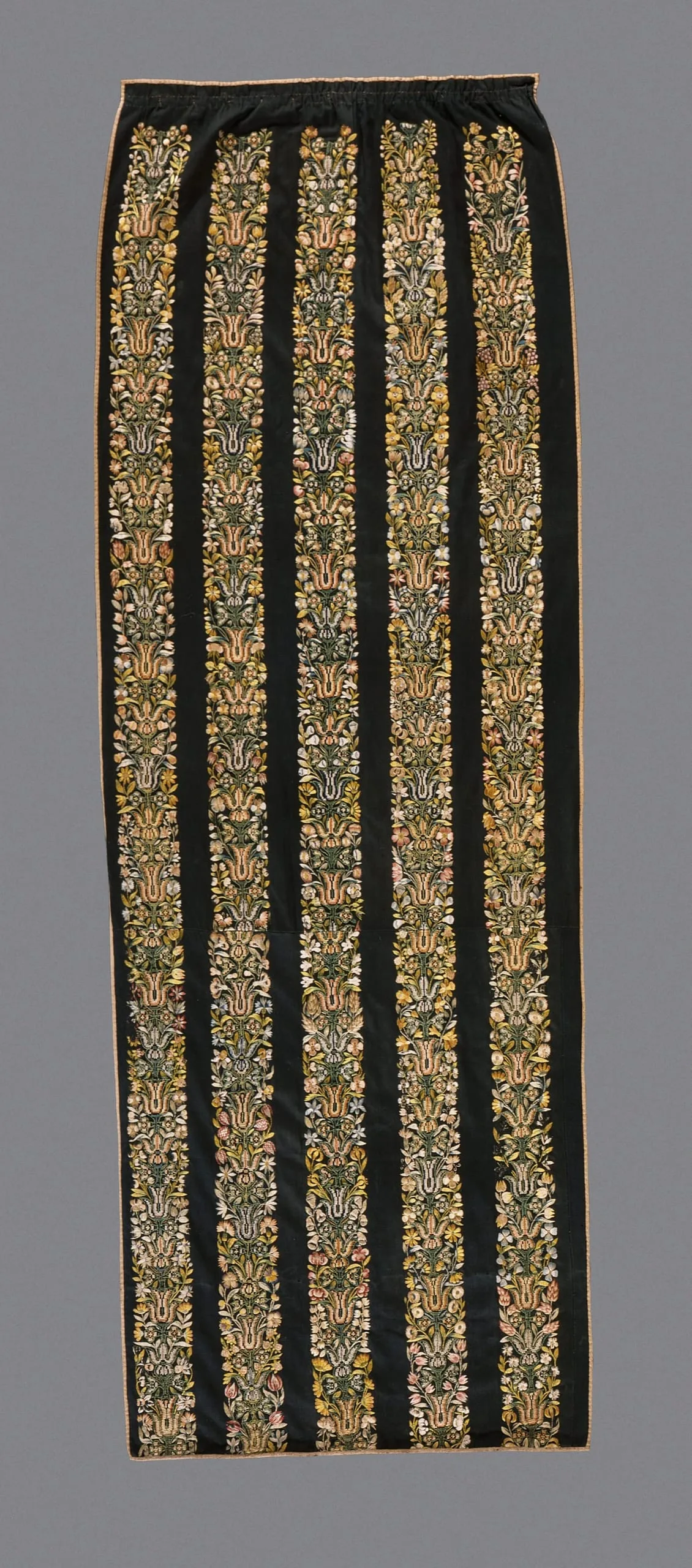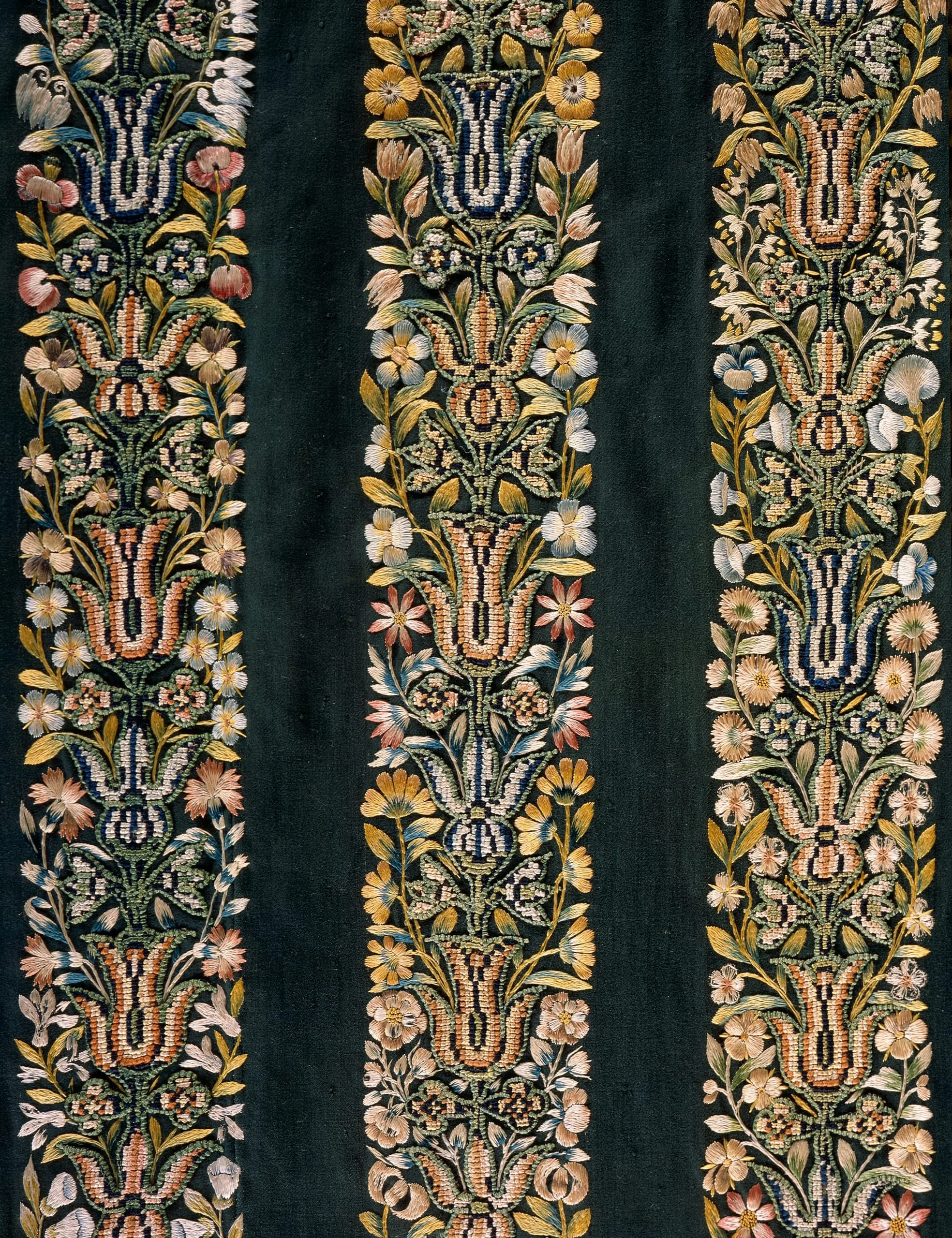 - Wool twill with silk embroidery, linen appliqué with silk embroidery, and silk fringe