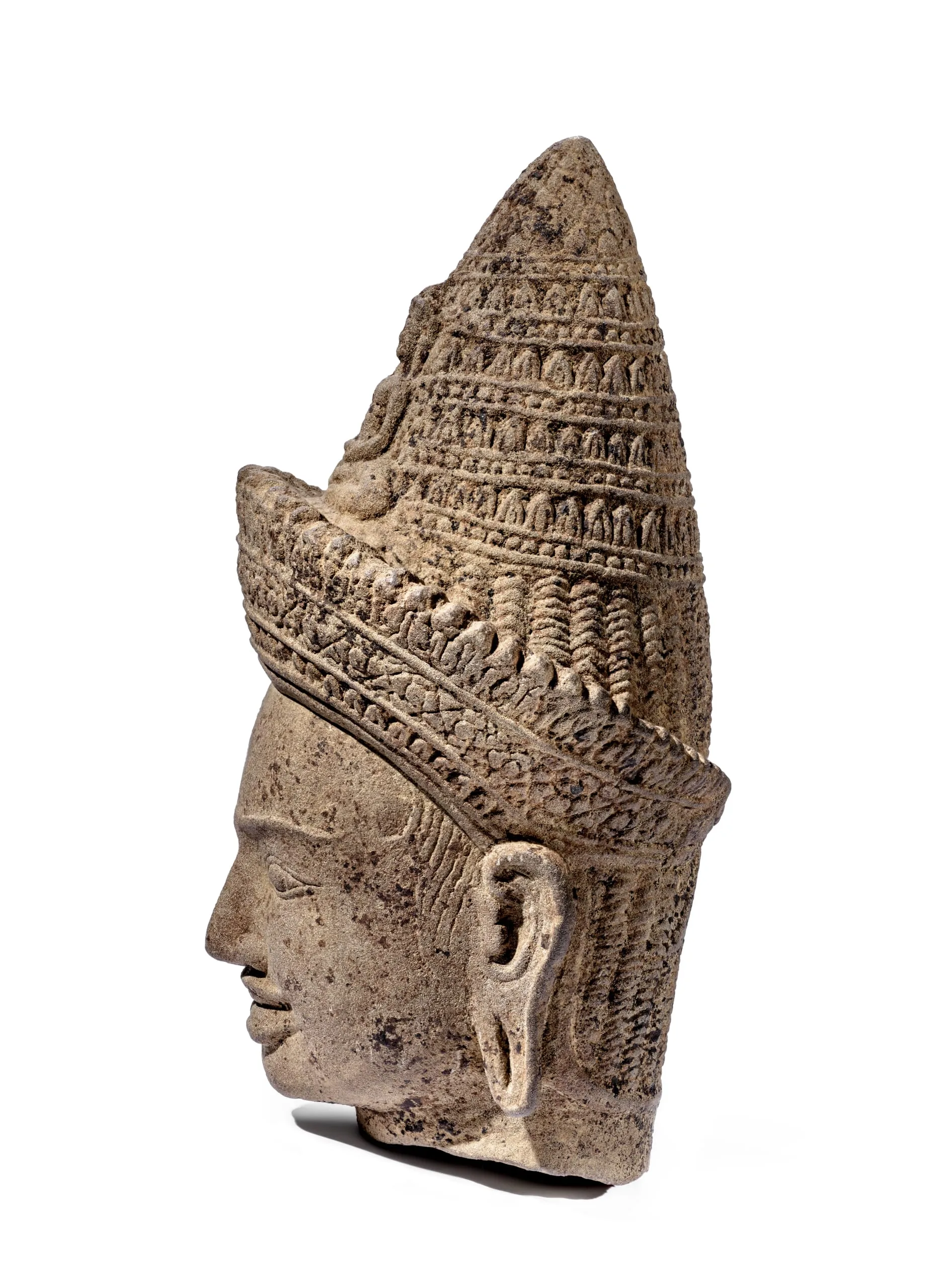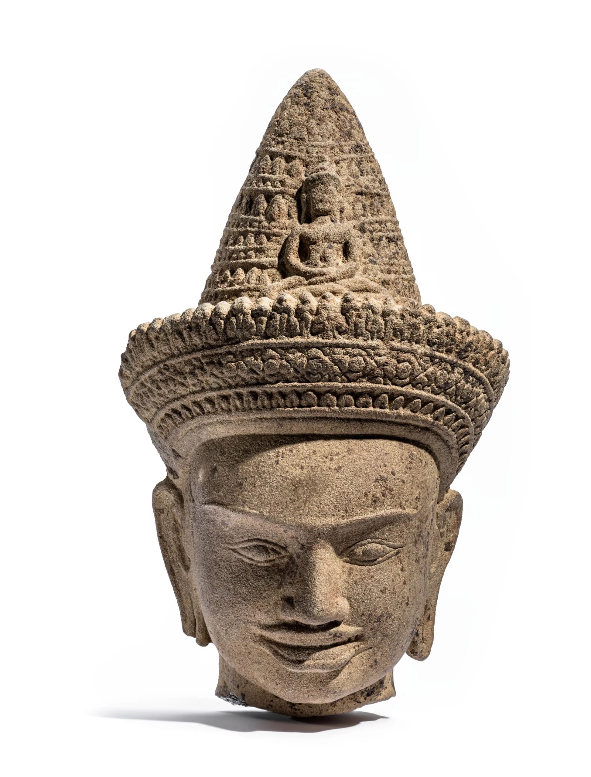 This crisply carved sandstone head wears a diadem and has a conical headdress with an identifying small image (bimba) of the emanation source deity, which is here depicted as a Buddha seated in the meditation posture (padma asana) with his hands held in the gesture of meditation (dhyana mudra). Accordingly, this head could represent the Bodhisattva Avalokiteshvara with the Jina Buddha Amitabha in his crown, who is portrayed as here, or it could be the goddess Prajnaparamita with the Jina Buddha Akshobhya, who is sometimes represented with his hands held in the meditation gesture. Without the original body of the deity, it is difficult to ascertain who the head represents because the physiognomy of male and female deities in Cambodian sculpture of this period is virtually identical unless they are mustachioed. (Brown 2008, p. 85). This head has full lips, but no mustache.