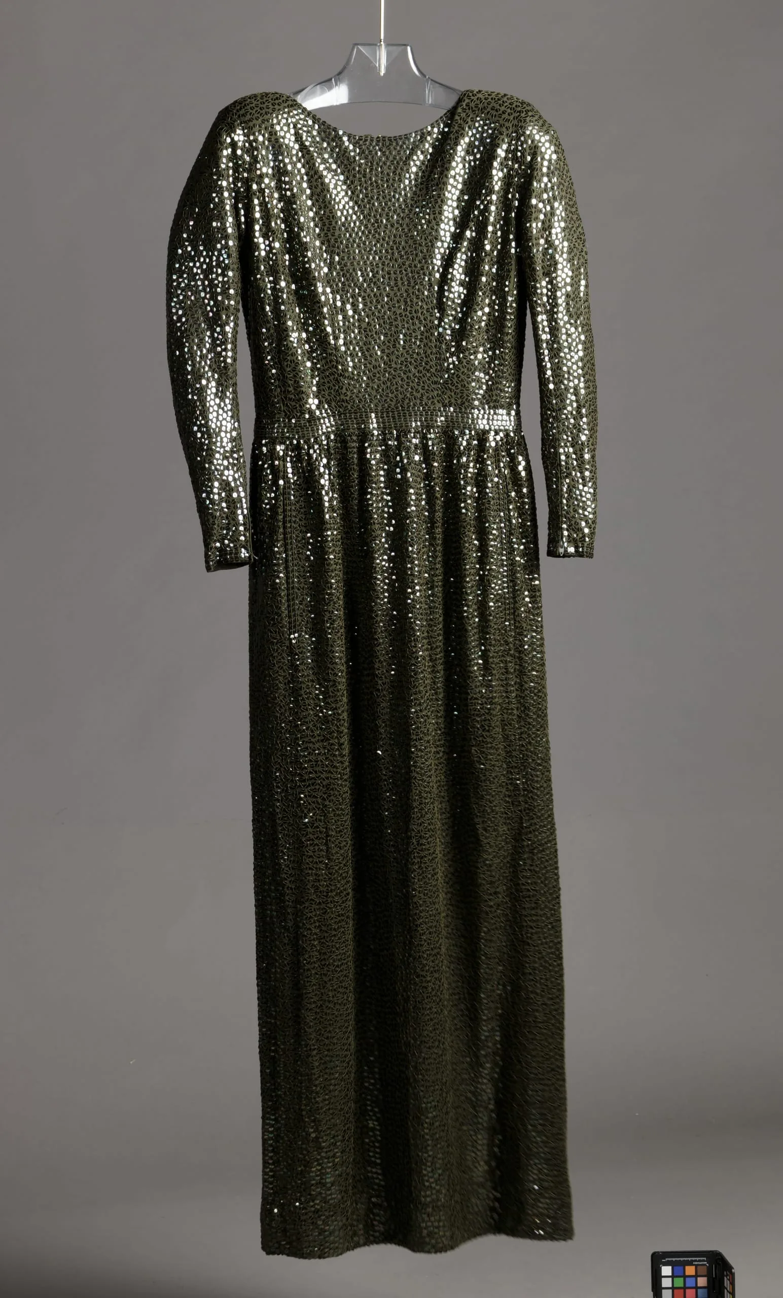 Floor-length olive-green sequined evening gown with padded shoulders, fitted long sleeves, ruched waist, and full skirt, hanging on a clear plastic hanger