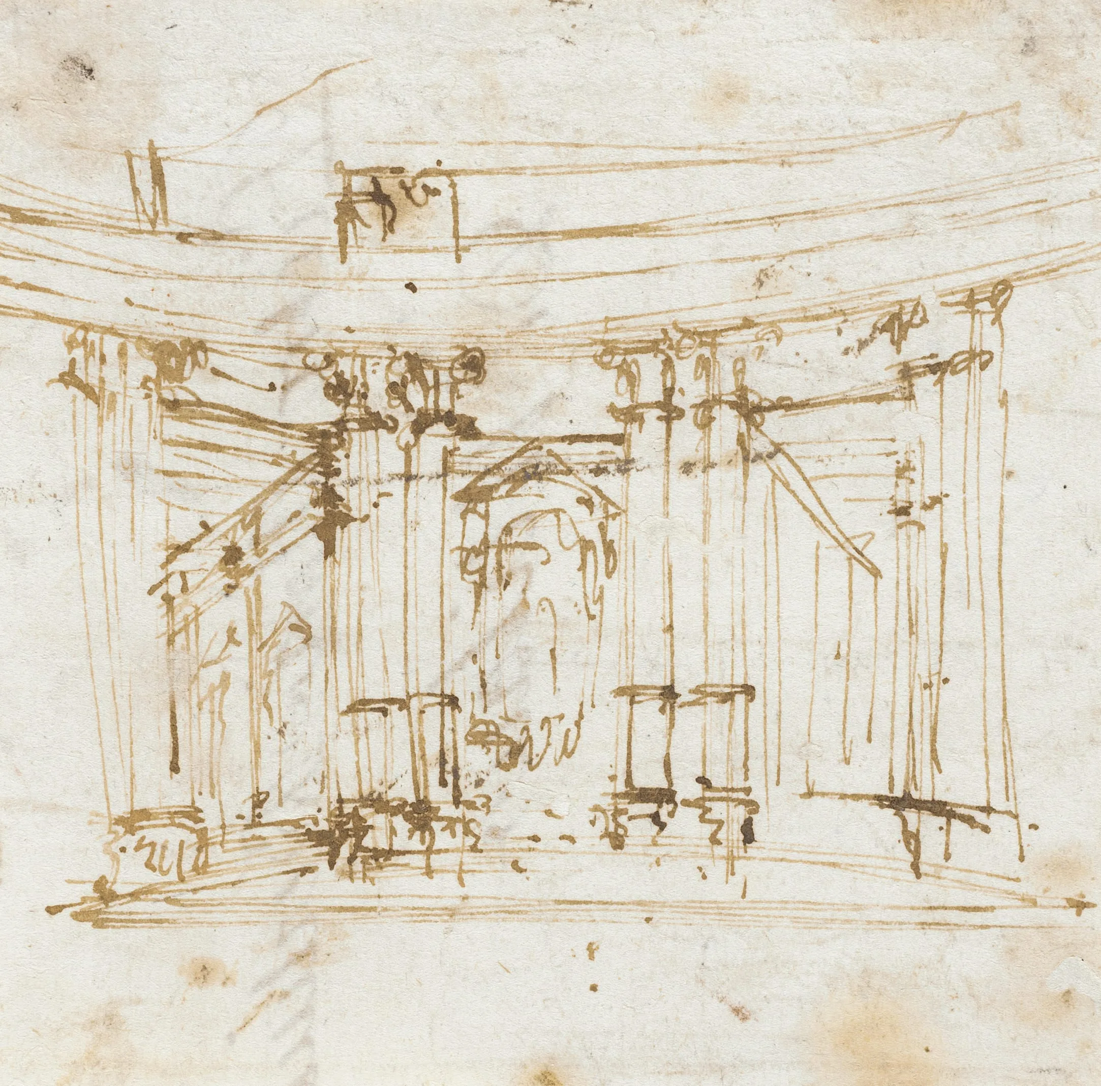 Architectural sketch in brown ink on cream paper, loose gestural strokes depicting a curved colonnade with a central pedimented niche