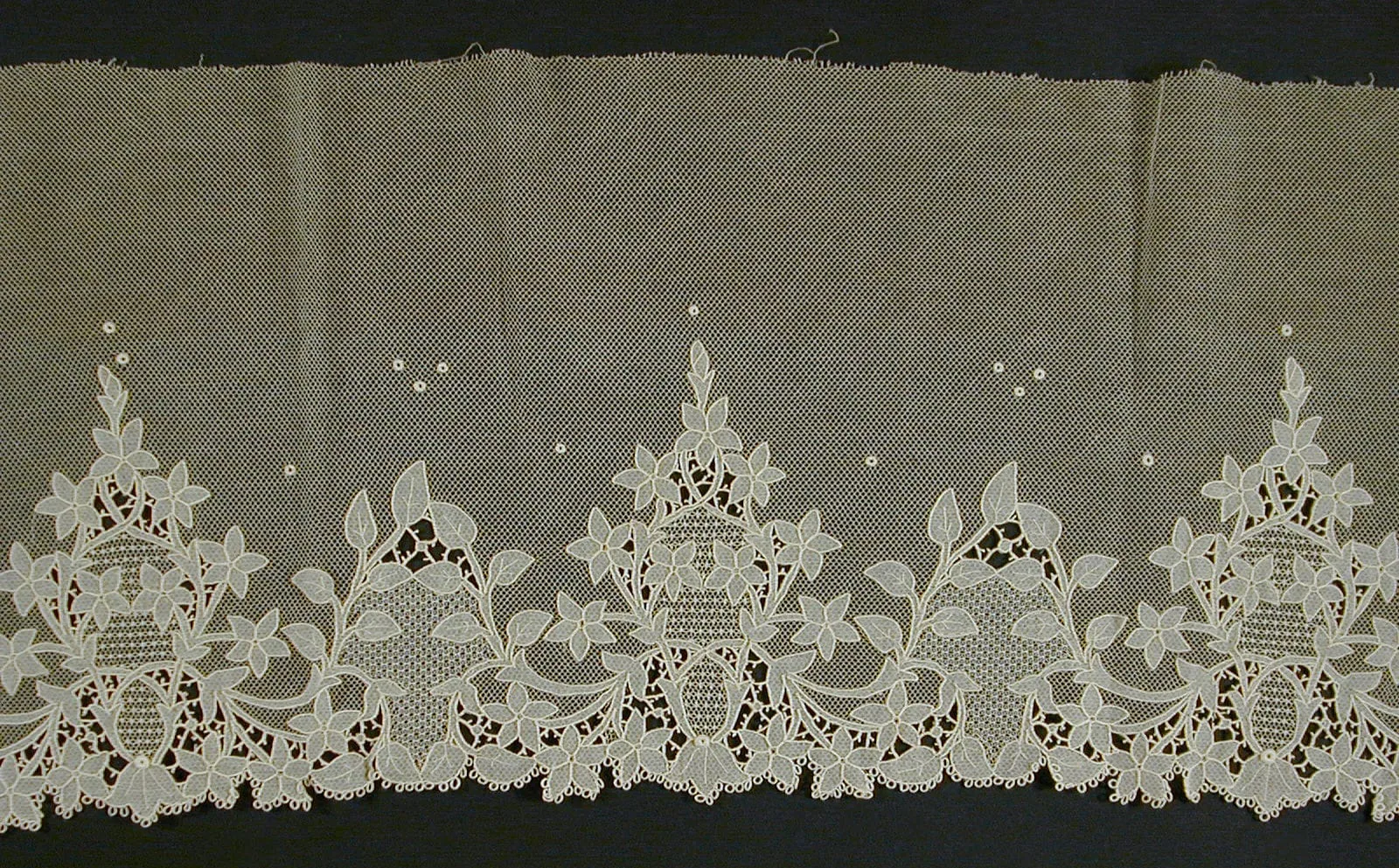 - Cotton Carrickmacross appliqué embroidery on machine net