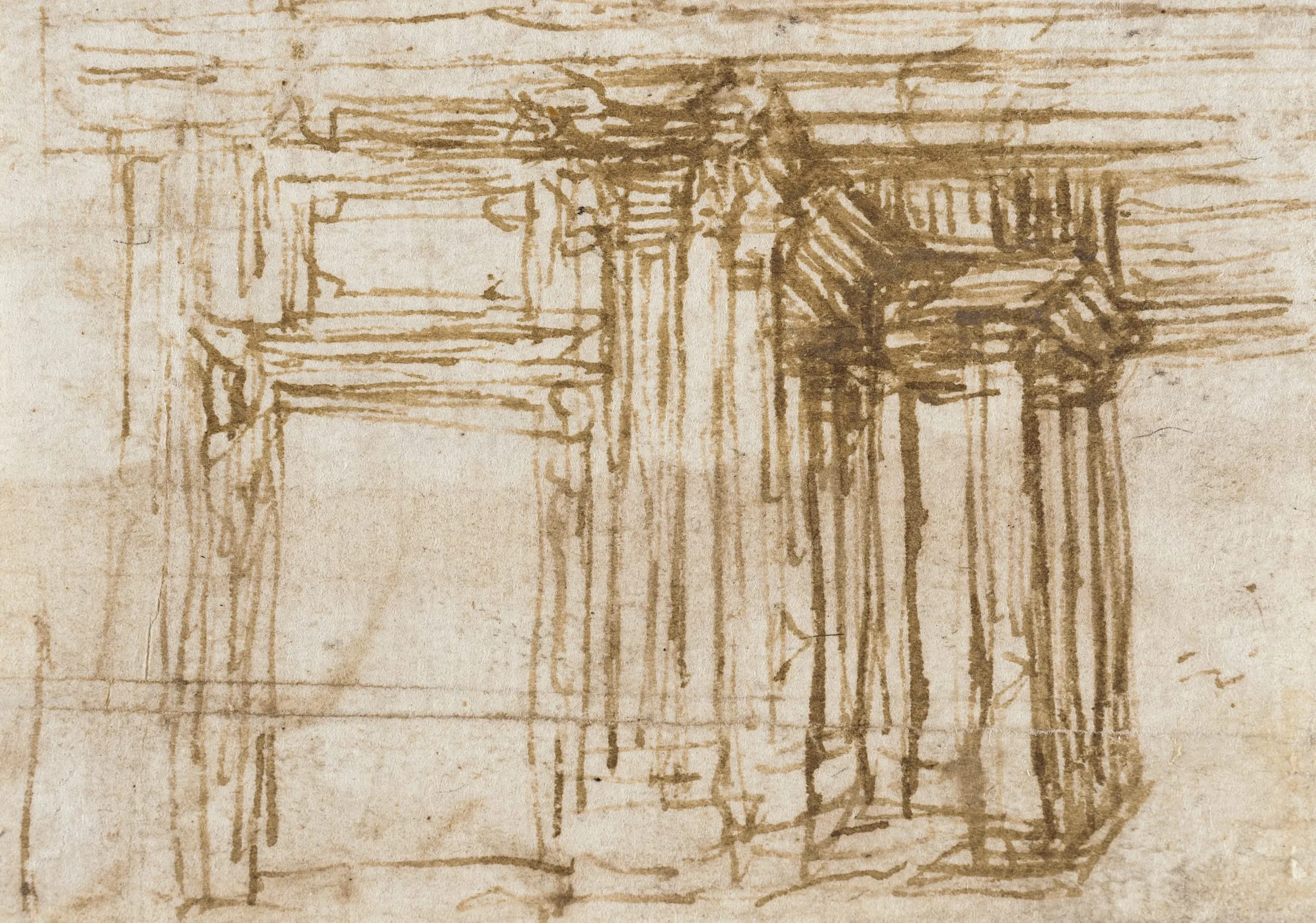 Architectural sketch in brown ink on cream paper, with rapid gestural strokes depicting a framed wall or doorway at left and a columned portico or colonnade at right