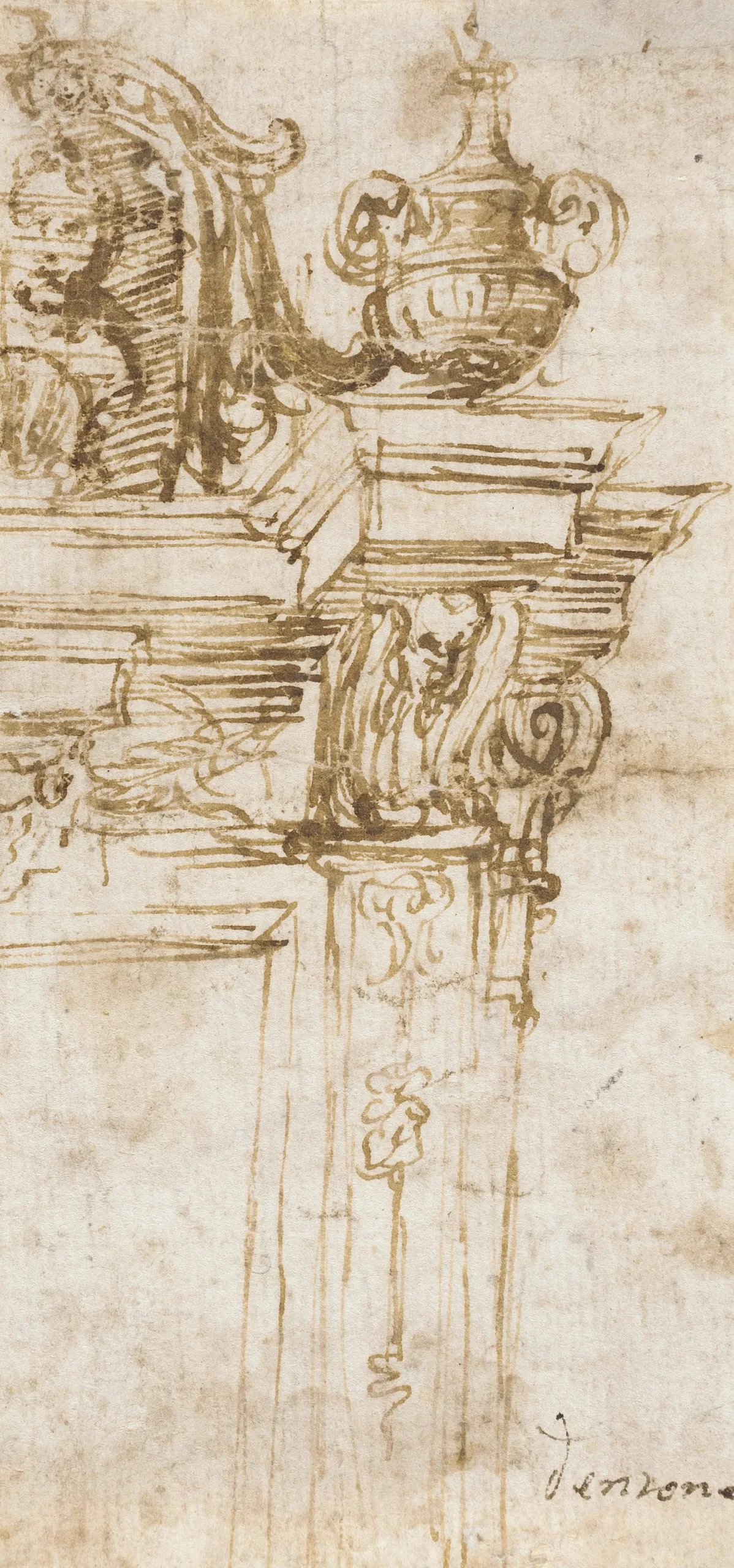 Brown ink drawing on cream paper, architectural study of a classical column capital, entablature, and urn finial with loose, sketchy strokes