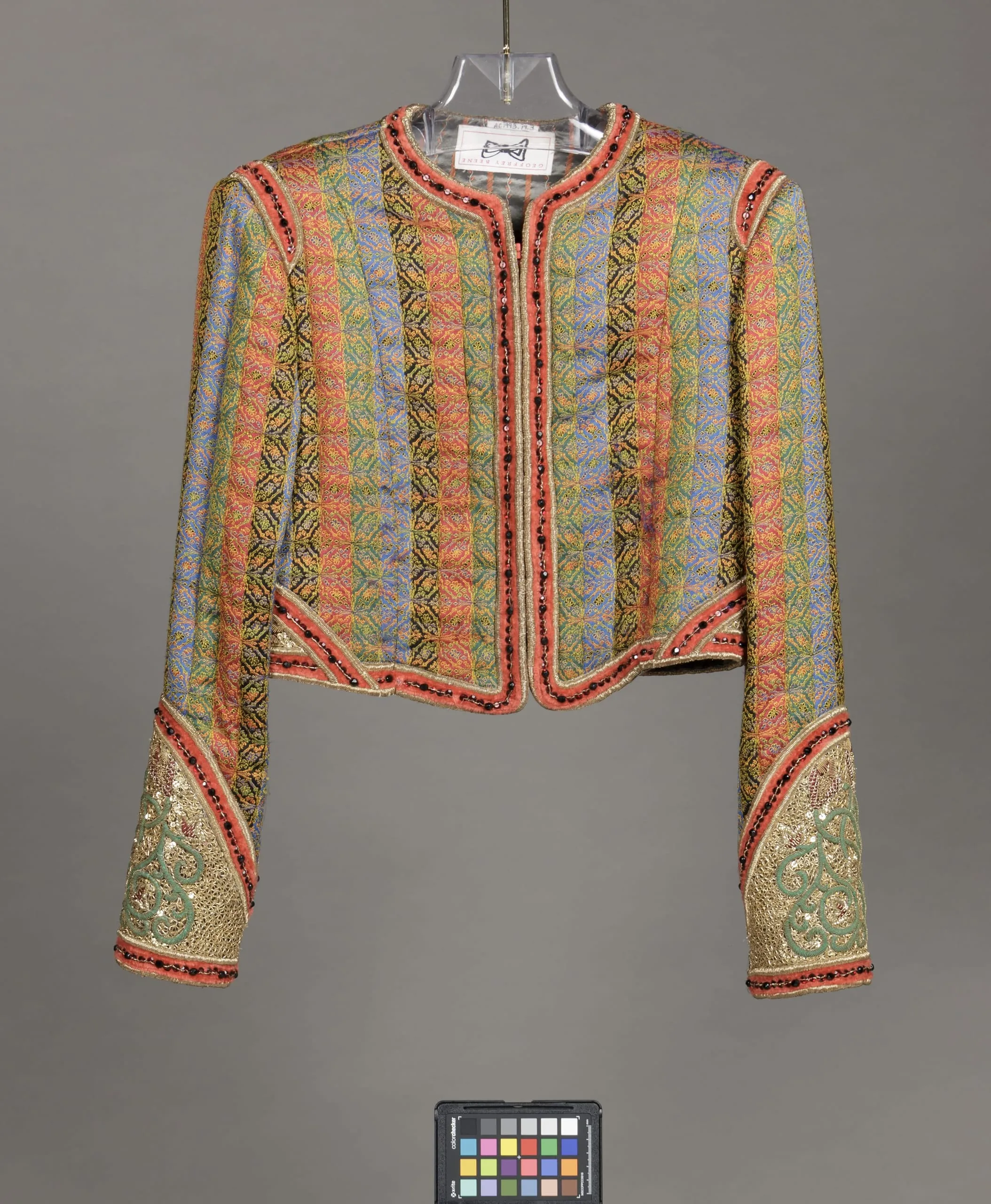 - Silk figured weave, quilted, with metallic thread trim, metallic sequins, crystals, and silk chenille trim