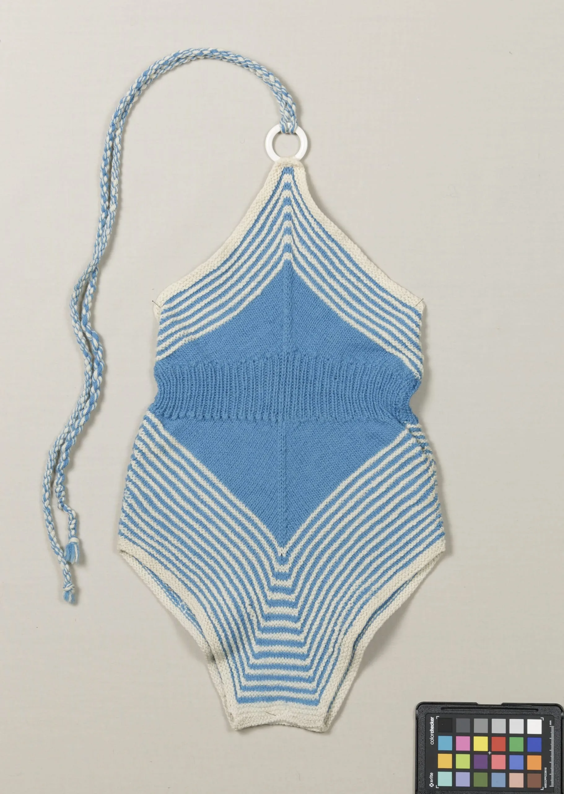 Knitted one-piece garment laid flat, with concentric cornflower blue and off-white stripes forming a diamond pattern, and a braided cord at the top