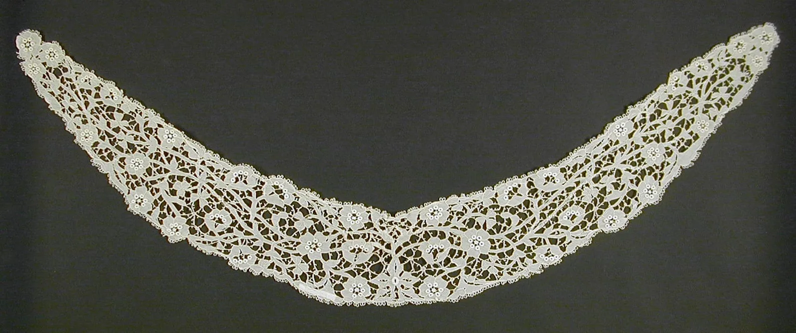 Ivory bobbin or needle lace collar in a crescent shape, with repeating floral rosette motifs and open lacework ground, displayed flat against a gray background