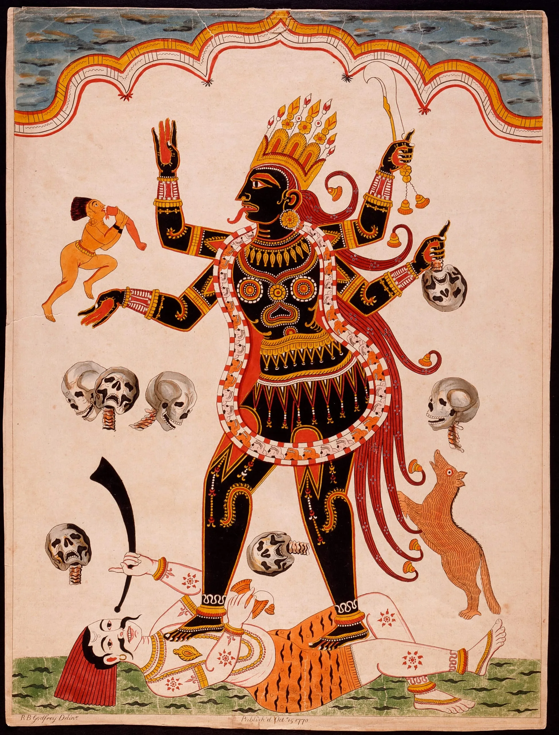 Although he has taken liberties with the decorative patterns on the bodies of Kali and the supine Shiva, and filled the scene with floating skulls, the English artist Richard B. Godfrey (b. 1728) has accurately portrayed the essential elements of Kali's and Shiva's iconography according to eastern Indian conventions. The image that Godfrey used as the inspiration for this print was most likely one of the forerunners of Kalighat paintings and ink drawings that were sold in the bazaars near the revered temple of the goddess Kali in the Kalighat area of southern Kolkata (formerly Calcutta) in the 19th- and early 20th-century. As this is the earliest work on paper that has come to light depicting Kali in a style closely related to that later developed by the Kalighat painters, this English print is thus an extremely important document for the study of the origins of Kalighat painting.