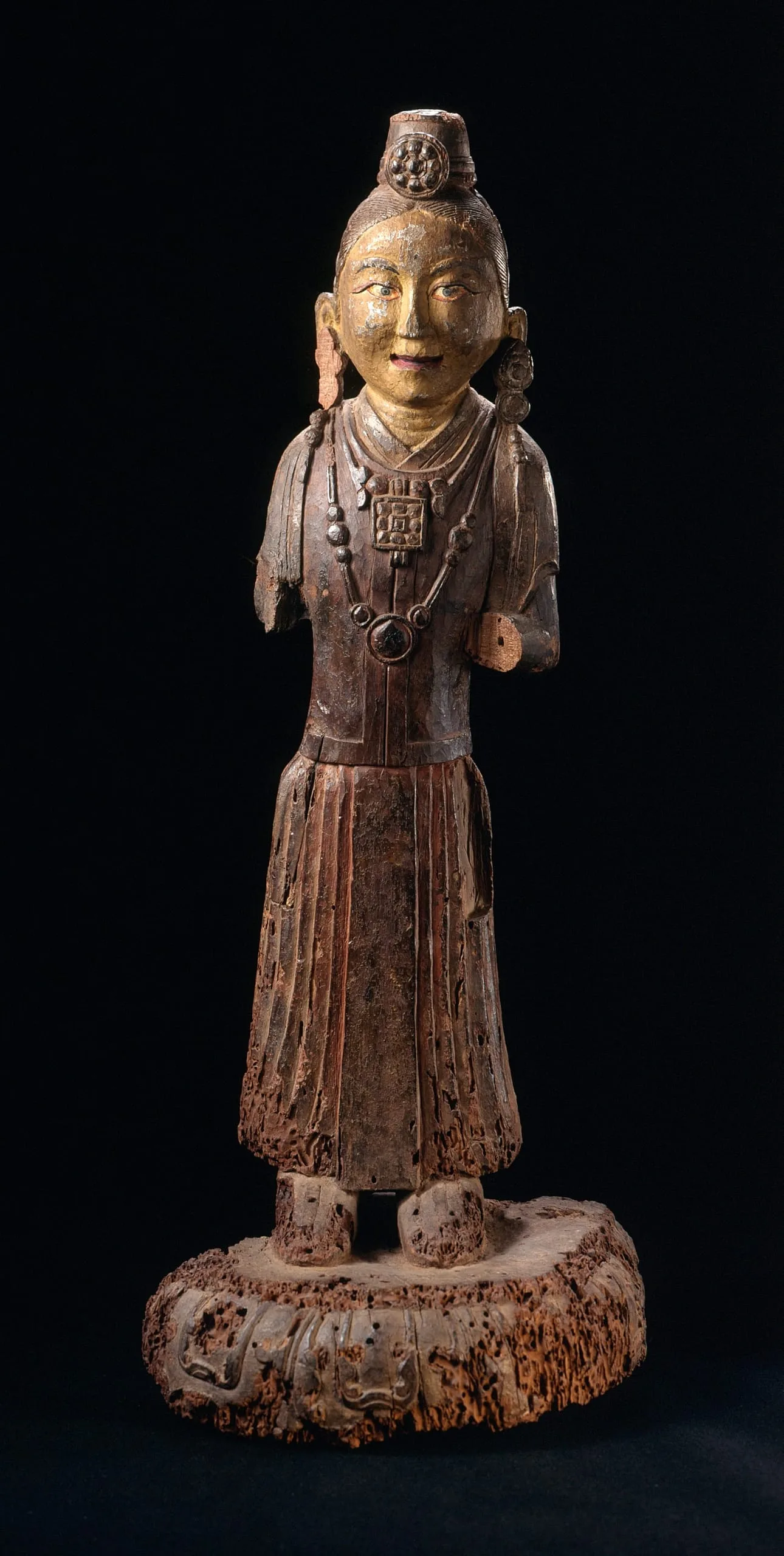 This unusual wooden sculpture of an unidentified elite woman standing on a lotus base has highly individualized facial features with staring eyes. This suggests that it may be a portrait, perhaps of a female donor or a royal patroness portrayed as an honorific attendant to a deity or Buddhist master. She wears a headdress with a lotus medallion, heavy jewelry including a square amulet box (ga’u), jacket, and long robe. The figure may have originally been part of a group of wooden sculptures in a temple niche or shrine.