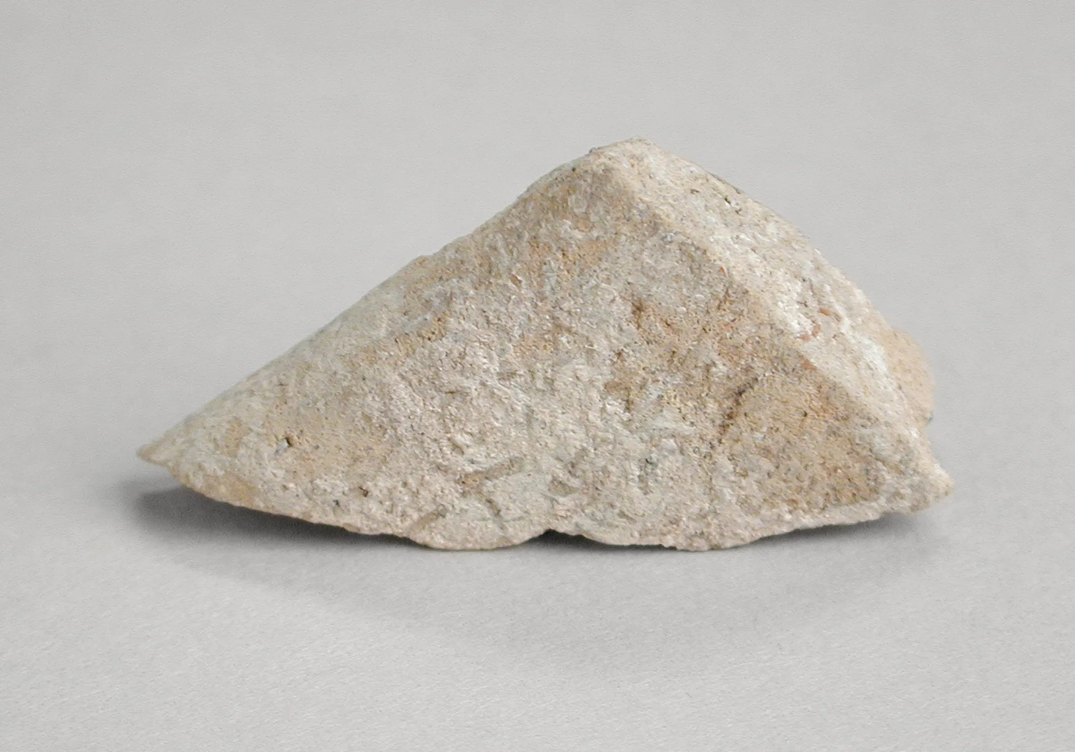 Ceramic shard with a roughly triangular profile, coarse chalky white and sand-colored surface with an uneven, pitted texture, photographed against a pale gray background