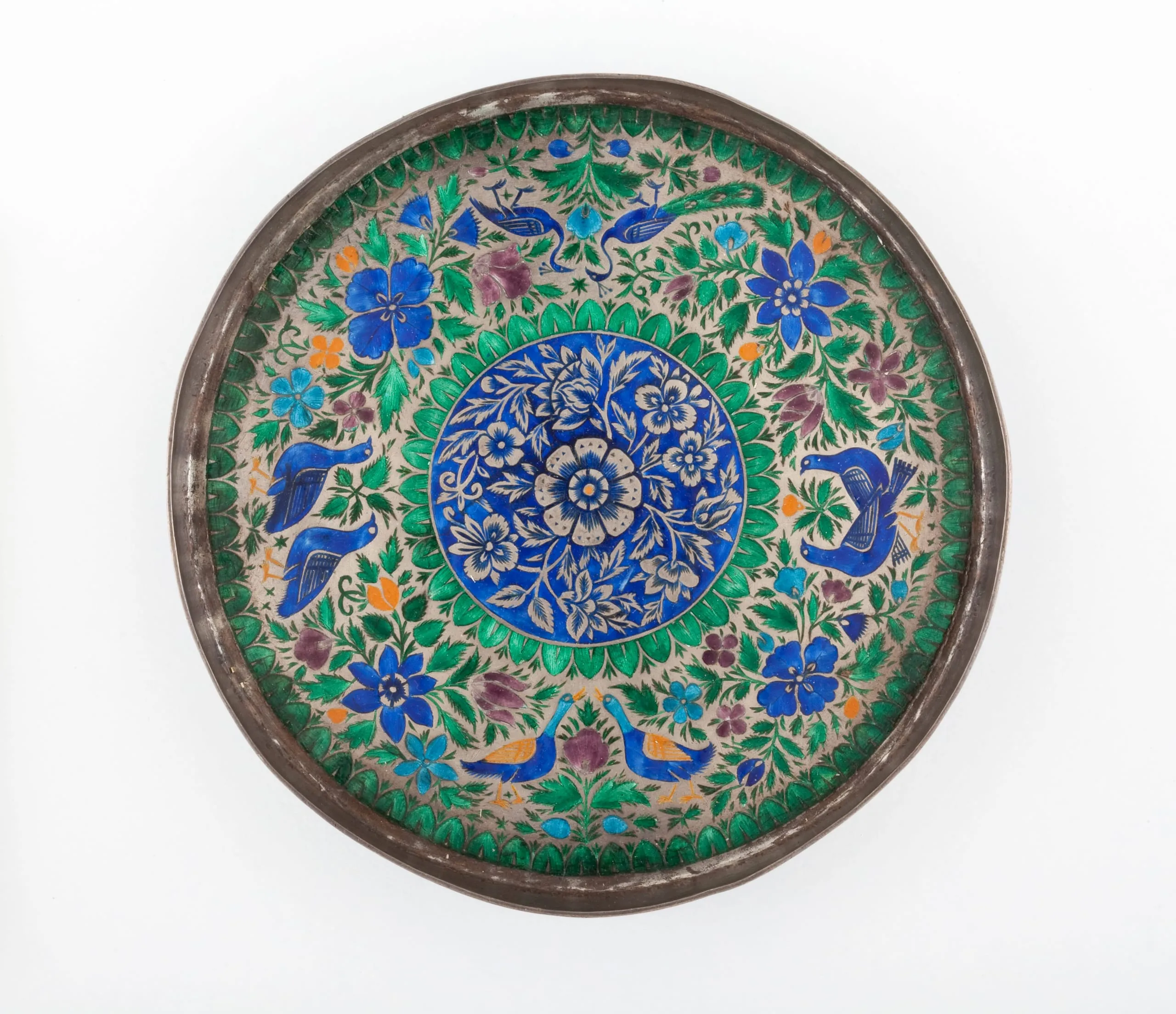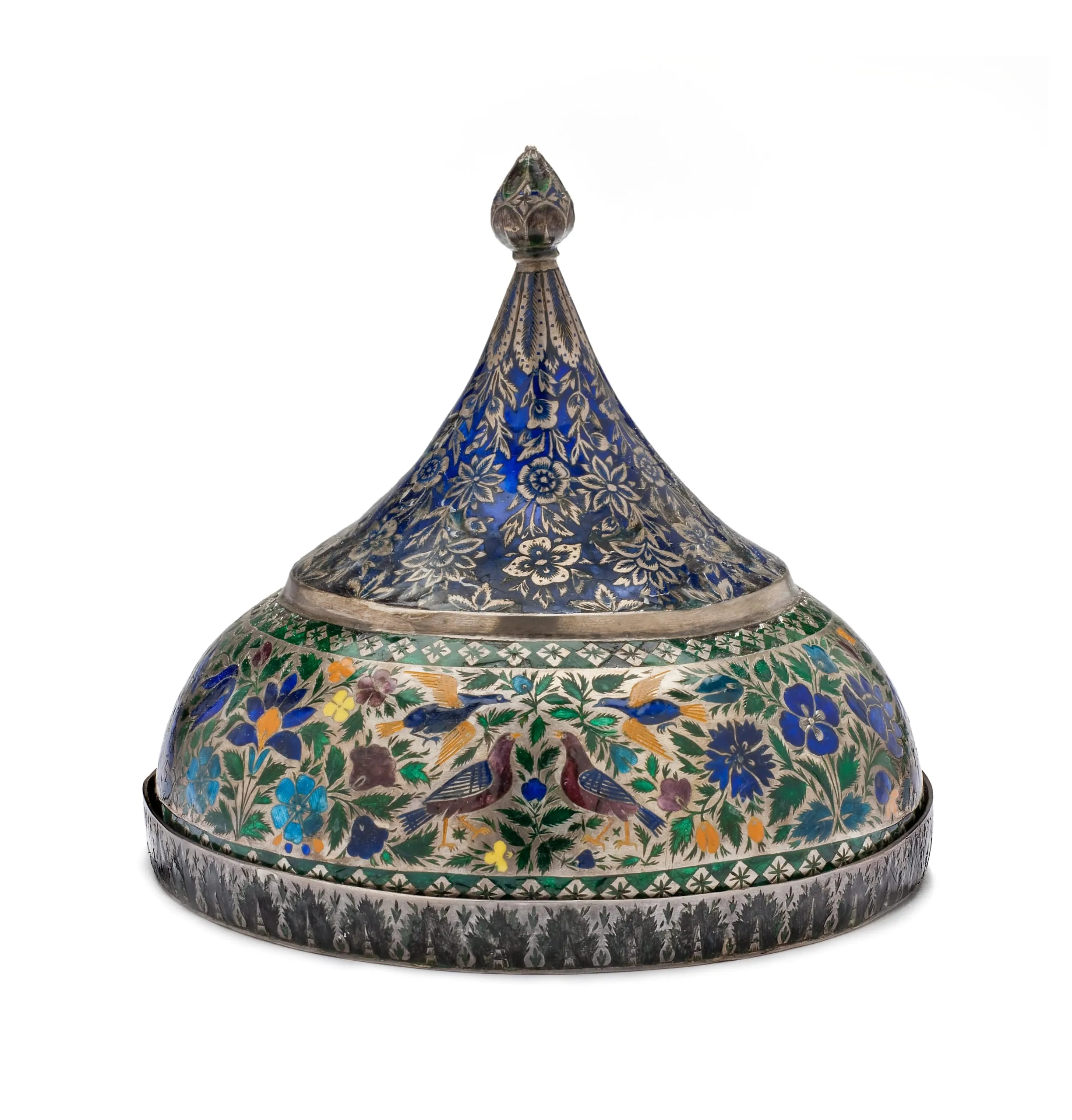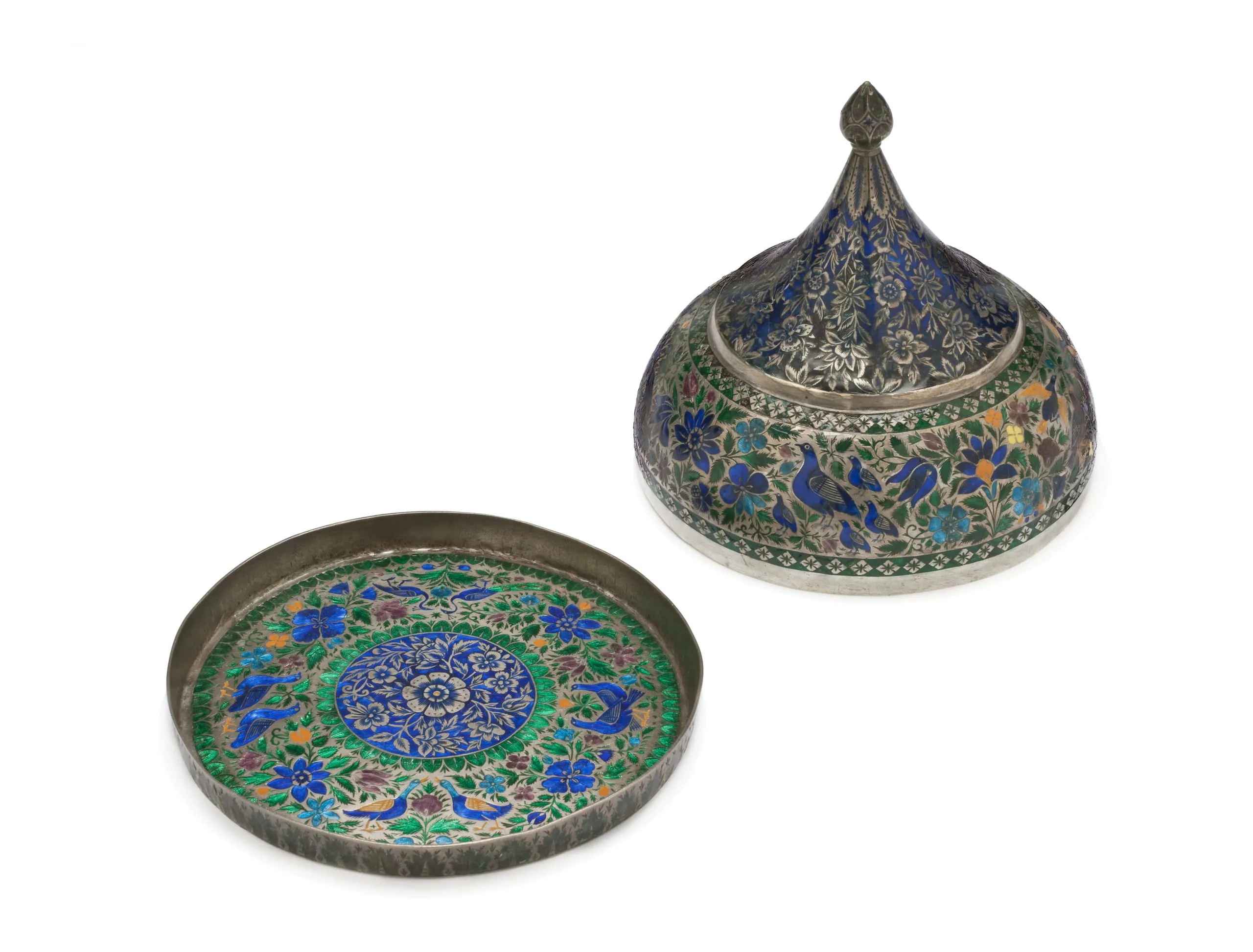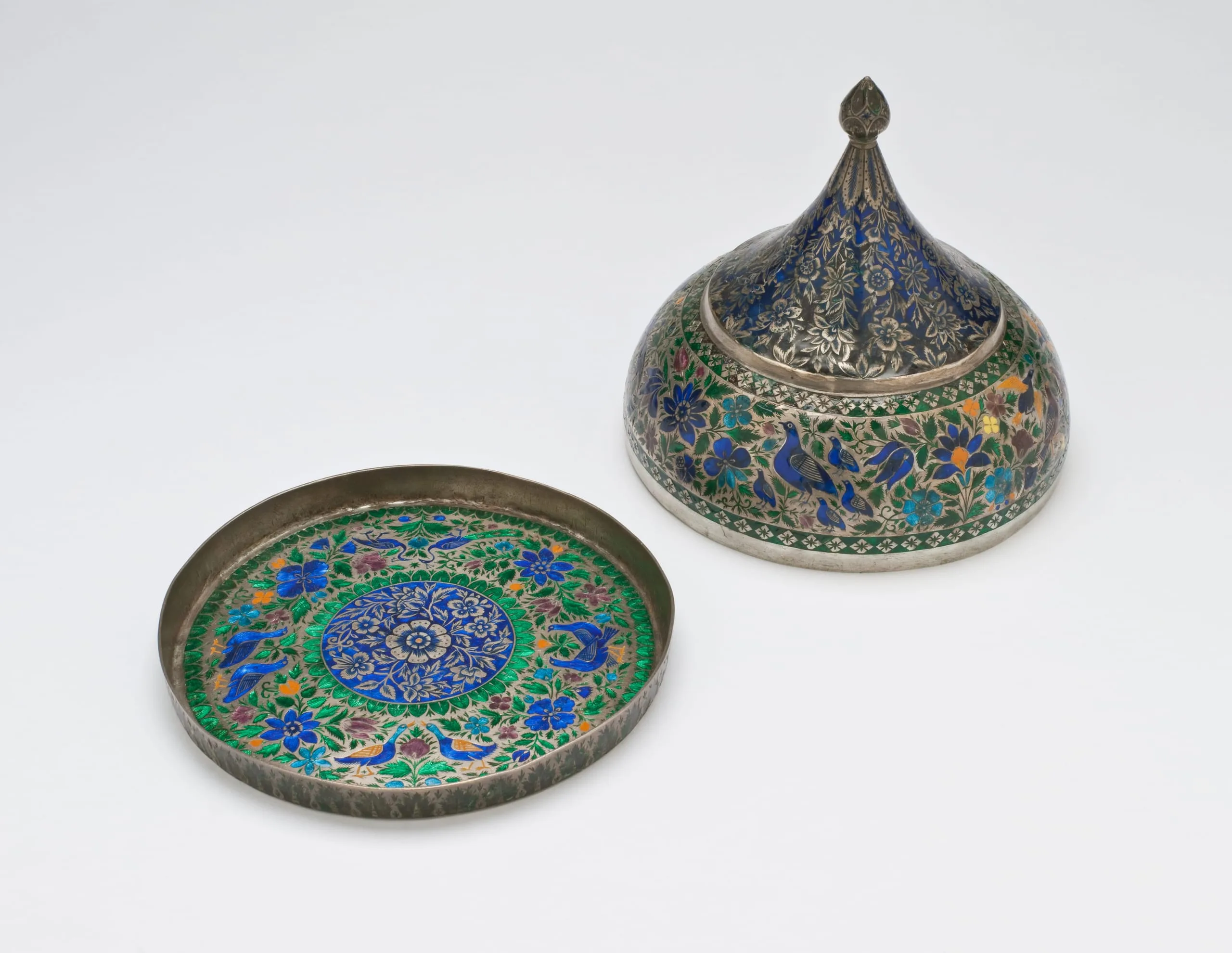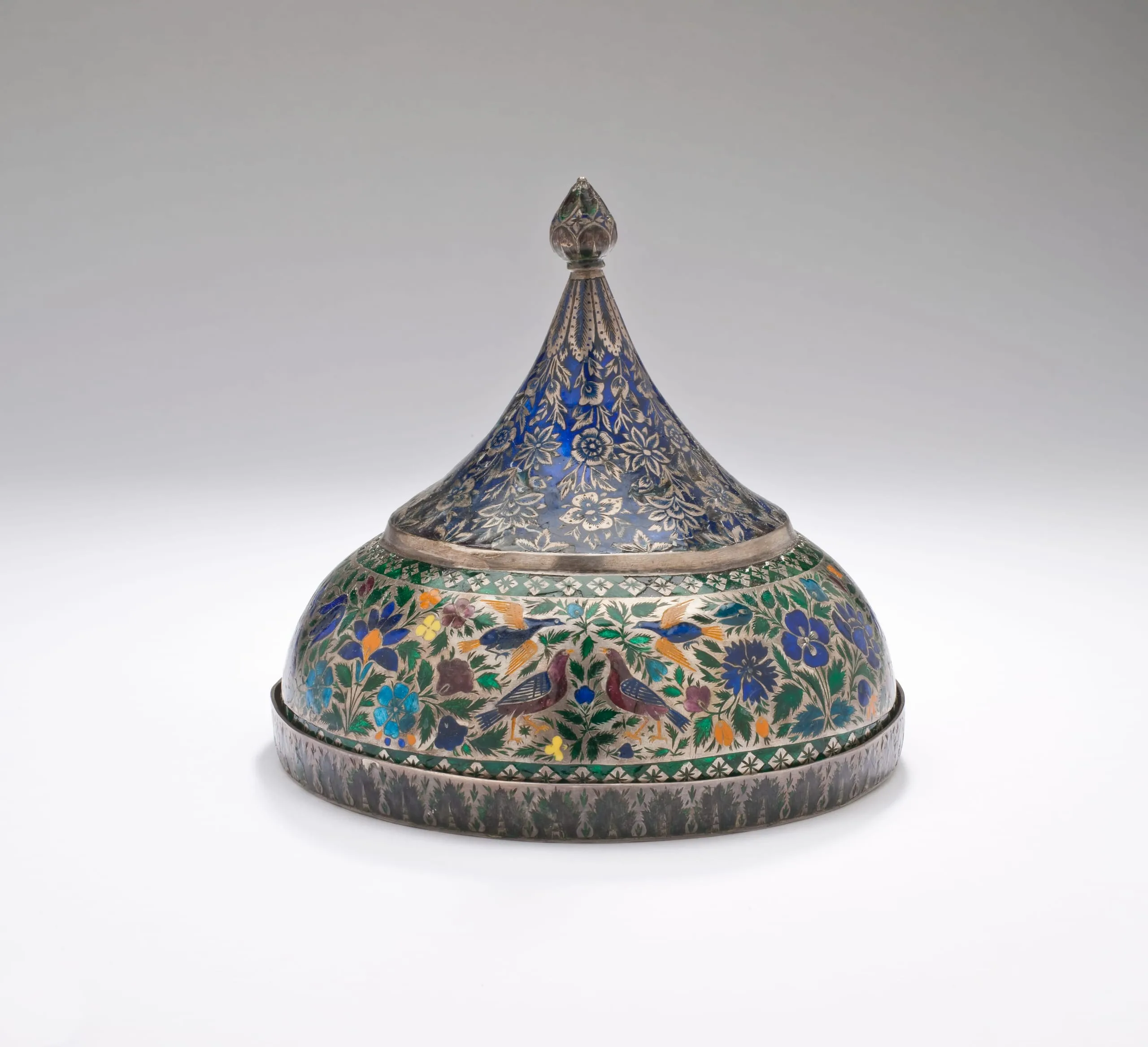 The lid’s ogival dome evokes the architecture of its place of origin, the fabled court city of Lucknow. It compares closely in silhouette to the contemporaneous Asafi Masjid in the Bara Imambara complex, built in 1784–91 under Asaf al-Daula (r. 1775–97). The betel box is attributed to circa 1780, shortly after his accession as Nawab (Governor). Asaf al-Daula oversaw the advancement and expansion of Lucknow as Awadh’s official capital, and his extensive promotion of cultural achievements created a golden era for the arts, including enameling.