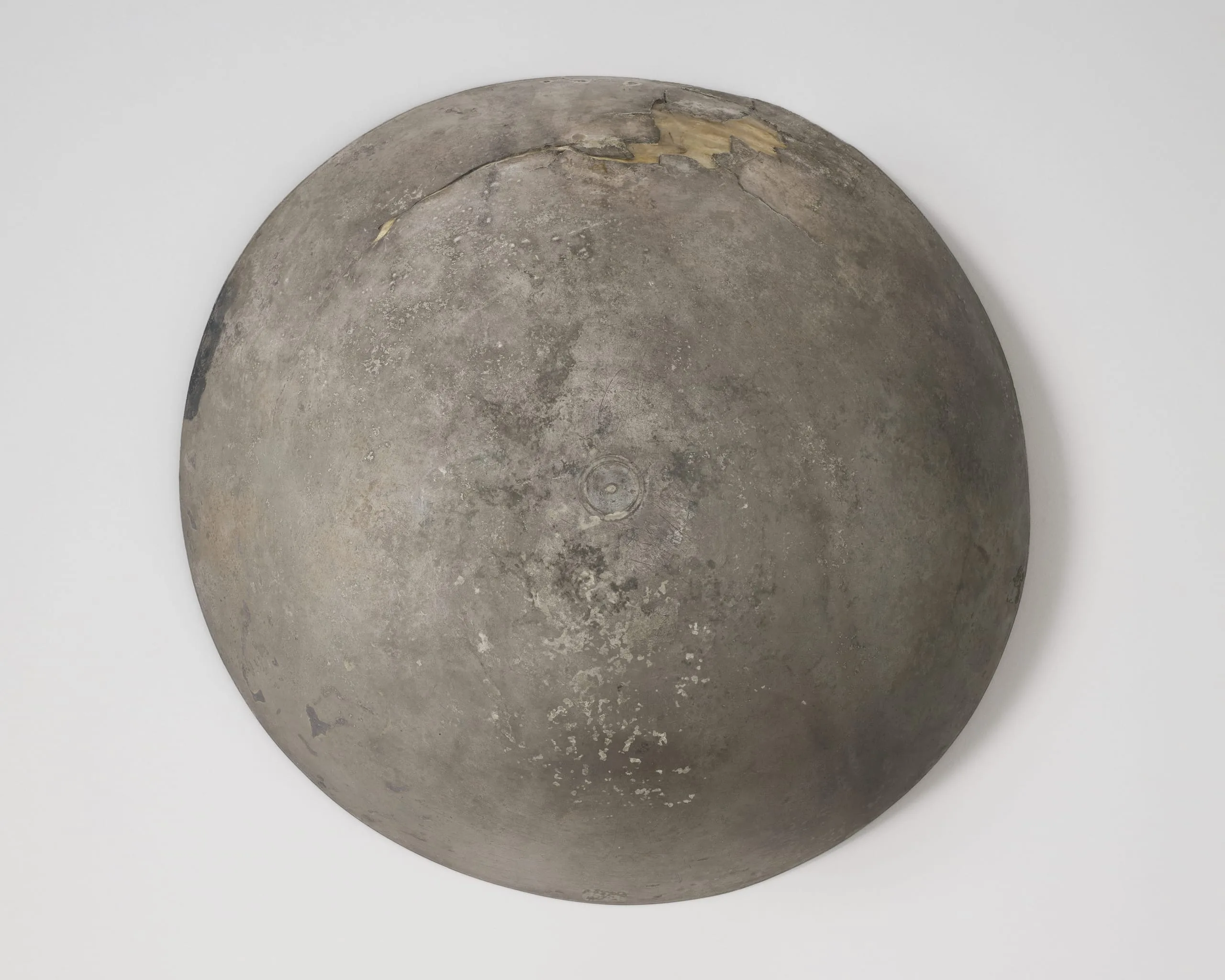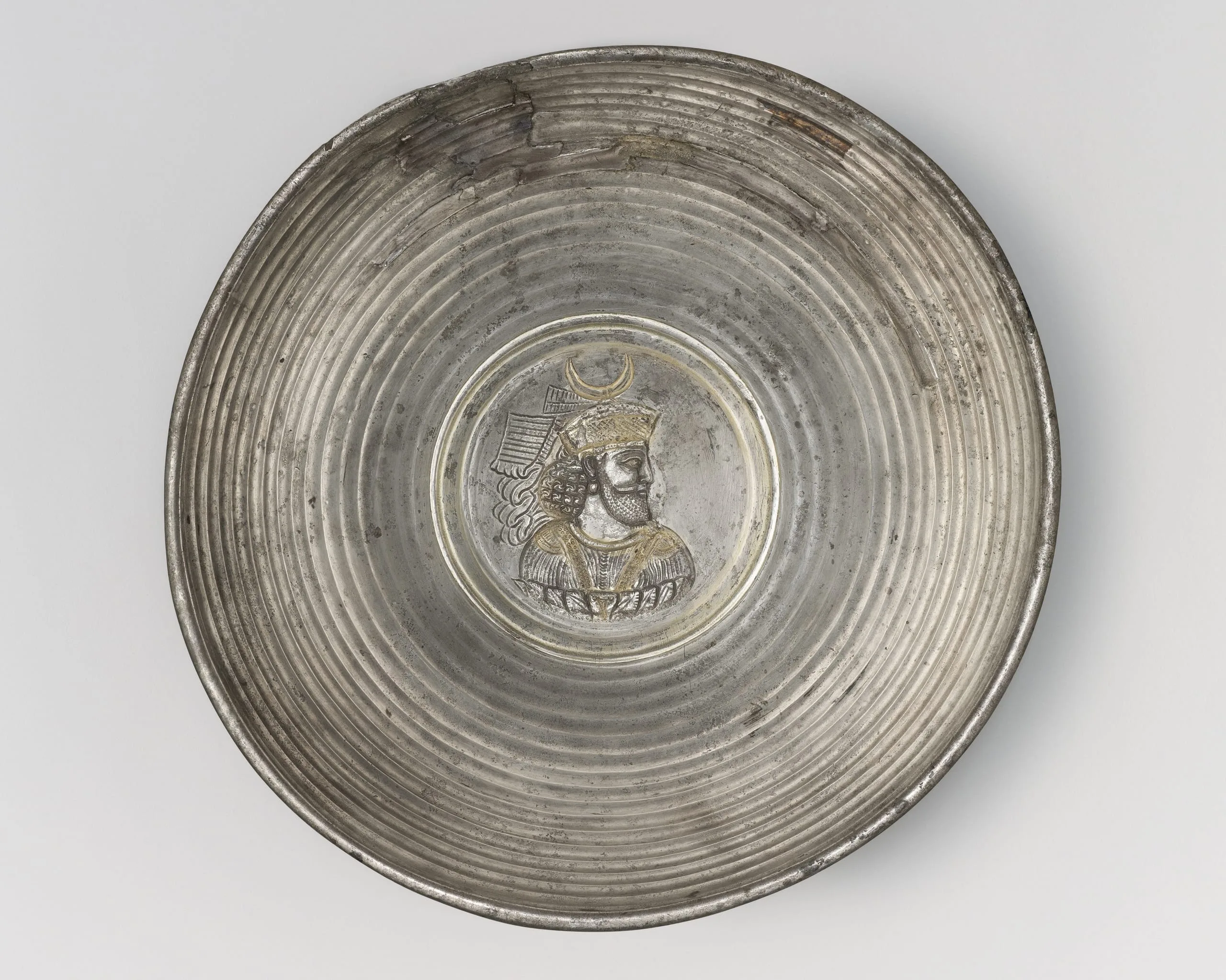 Silver vessels decorated with heads or busts of figures within a medallion are a distinctive category of Sasanian period (224-650) metalwork. This hemispherical bowl has sixteen concentric circles of fluting running from the rim to the outer molding of the central medallion. The bowl was formed by hammering, while the interior circles were carved. The raised figure was rendered by attaching a piece of cast silver into the vessel's center. The central figure, depicted frontally, wears a beaded halter, a feature of royal dress in the fourth century. The figure also has a coiffure of tight curls bound at the neck and a full beard knotted below the chin. The design of the crown can be compared with that of Khosrow II (reigned 616-628), which is known from contemporary coins bearing his likeness.
