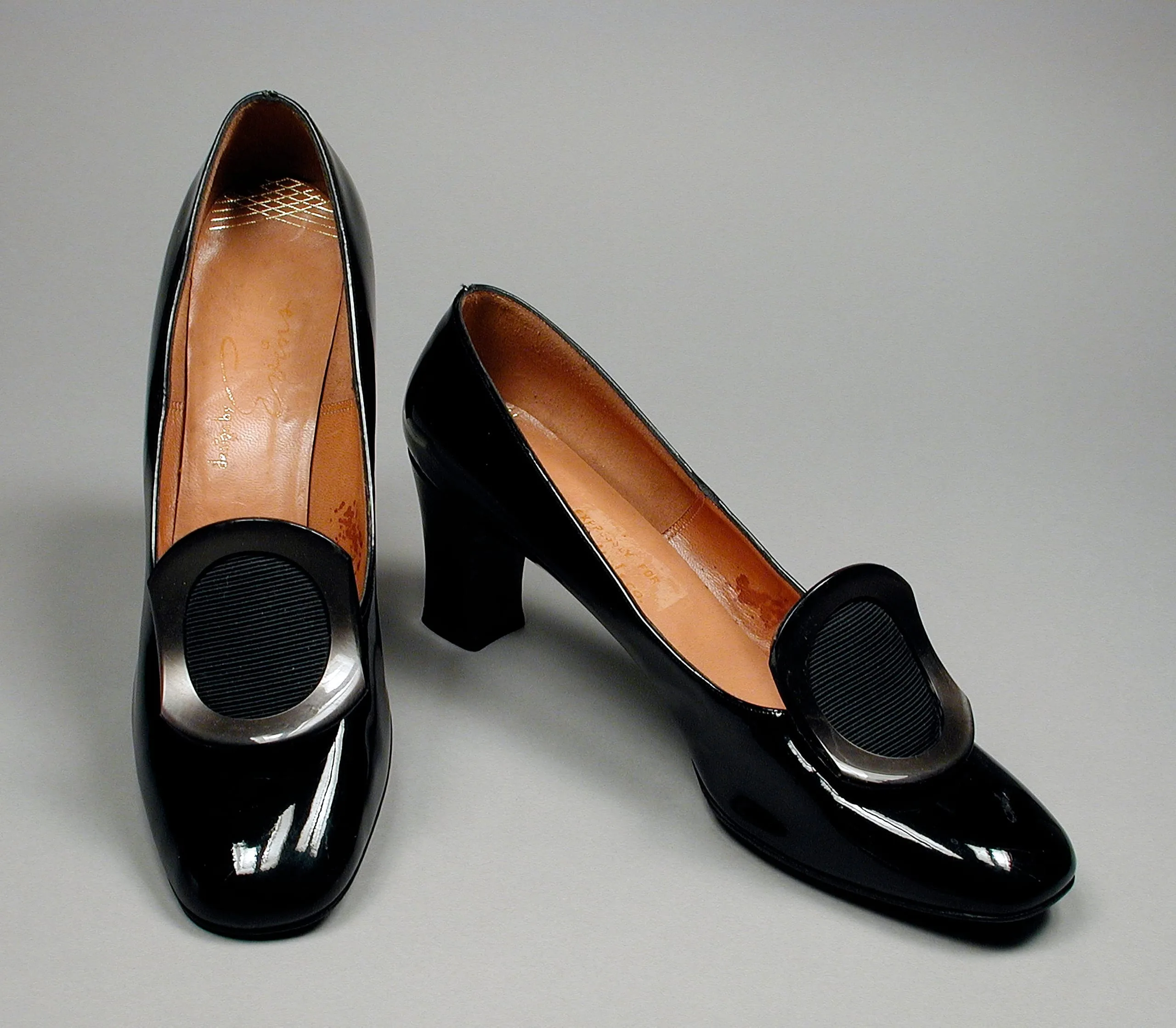 - Patent leather with plastic, silk plain weave (faille) and leather