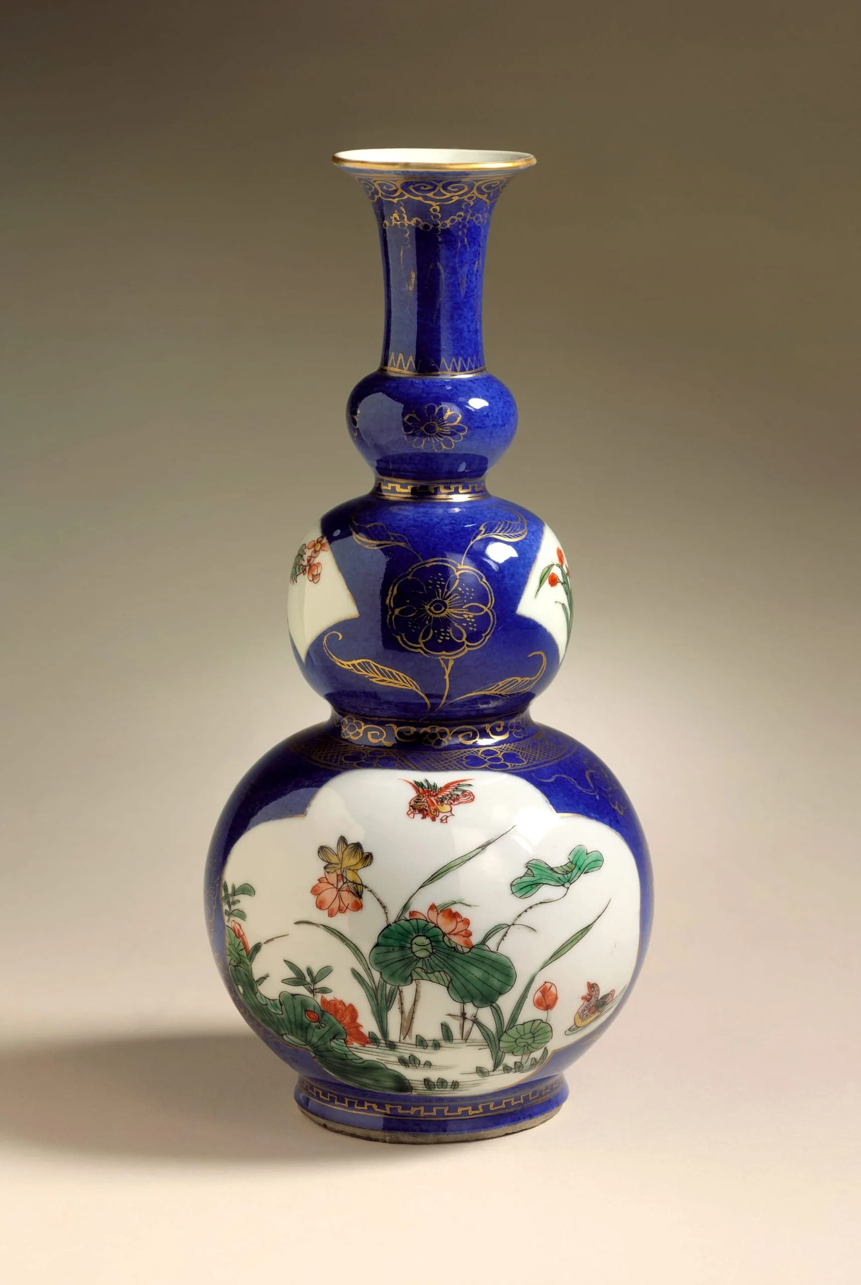 - Wheel-thrown porcelain with powder blue glaze, overglaze painted enamel decoration (wucai), and gilding