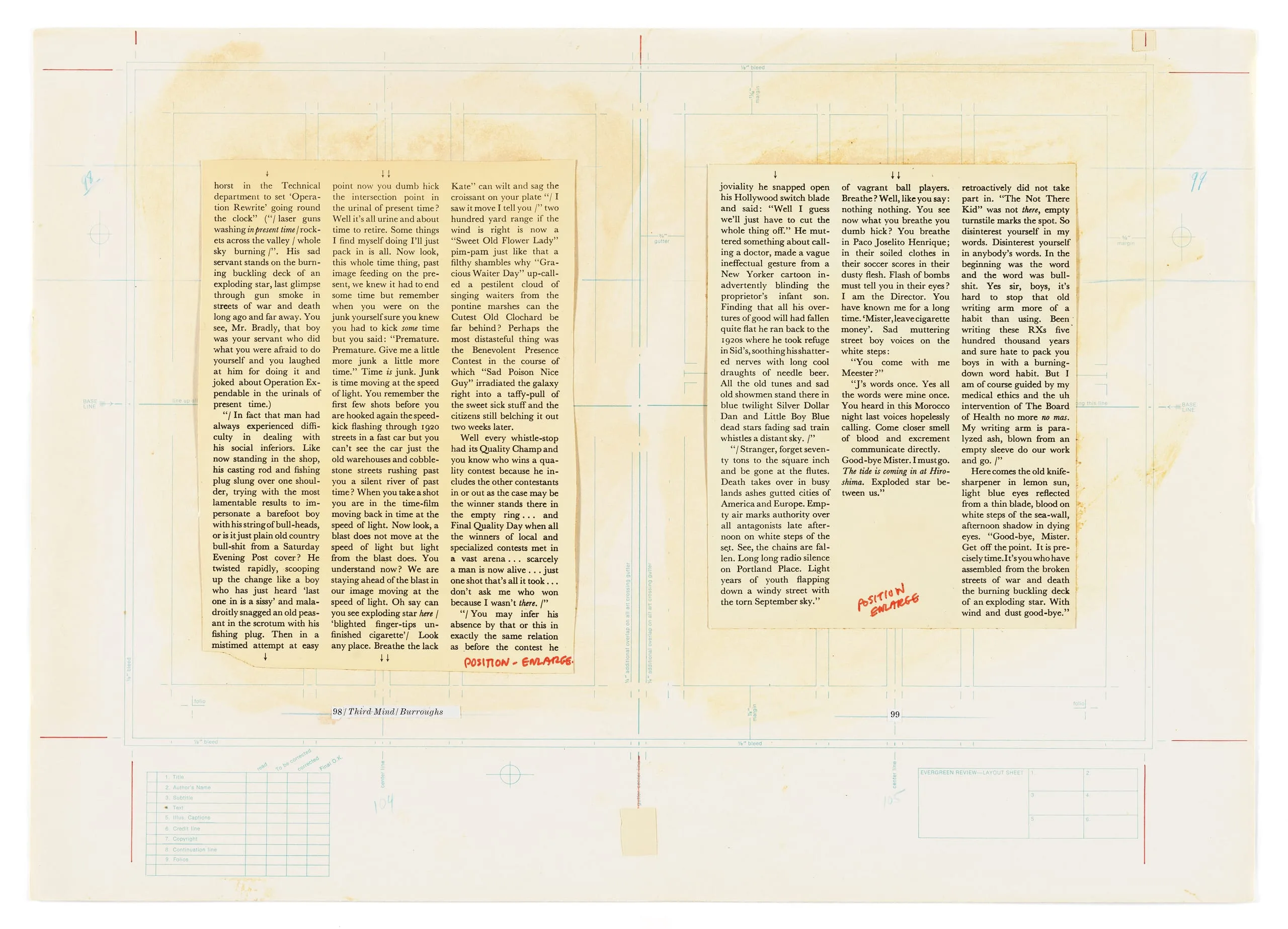 - Blue-line manuscript board, and mixed media, two text pages