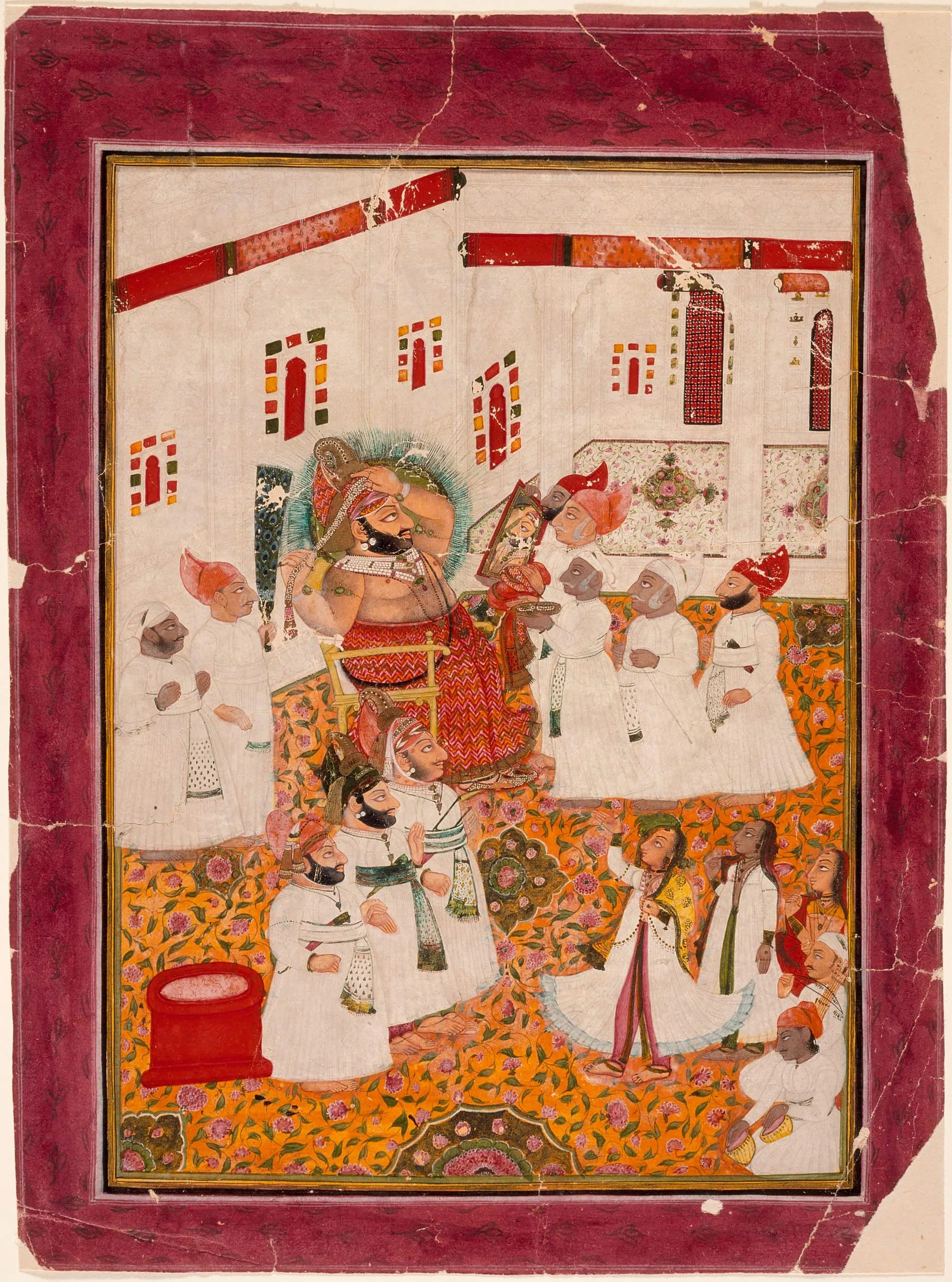 Maharana Bhim Singh of Udaipur (r. 1778-1828) was born in 1768, ascended the throne at age ten in 1778 under the regency of his mother Sadar Kanwar, and died in 1828. He was the 26th Maharana of Mewar (r. 1778-1818) and, after politically aligning Mewar with the English East India Company in 1818, the 1st Maharana of the Princely state of Udaipur (r. 1818-1828). Early in his reign Bhim Singh primarily commissioned portraits of himself hunting and in royal processions, but by circa 1800 his portraits were predominantly in palace settings attended by court women and servants. Here, he is shown seated in front a mirror held by a servant while tying his elaborate turban in preparation for the Teej Monsoon Festival. Mirrors are often represented in Bhim Singh portraits, both in mundane and erotic situations. European mirrors (called “looking glasses”) were imported in significant quantities for use in Mughal and Rajput courts.