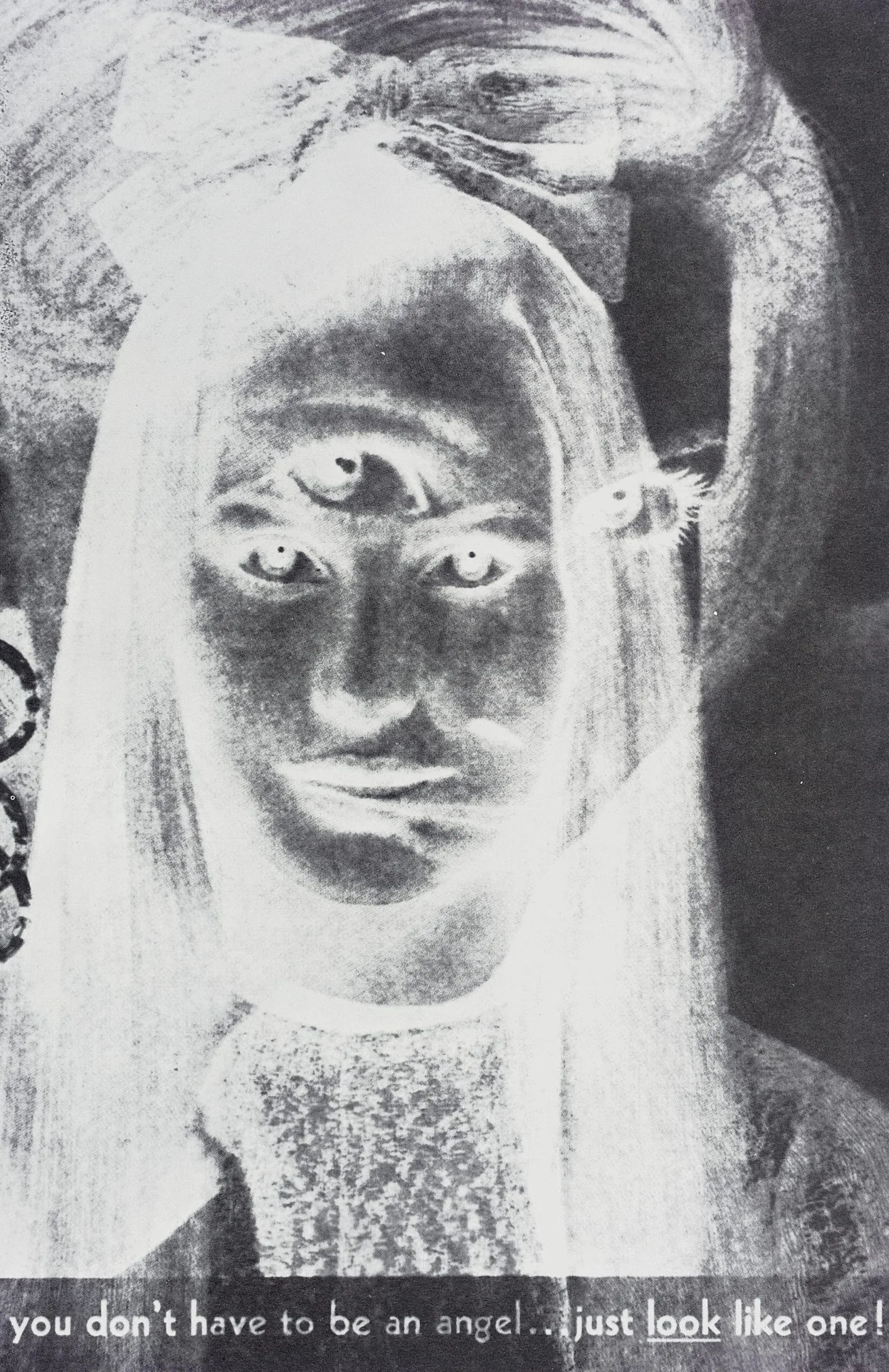 Black and white halftone print of a face with dark skin tones, wide eyes, and long pale hair, with bold text below reading 'you don't have to be an angel...just look like one!'