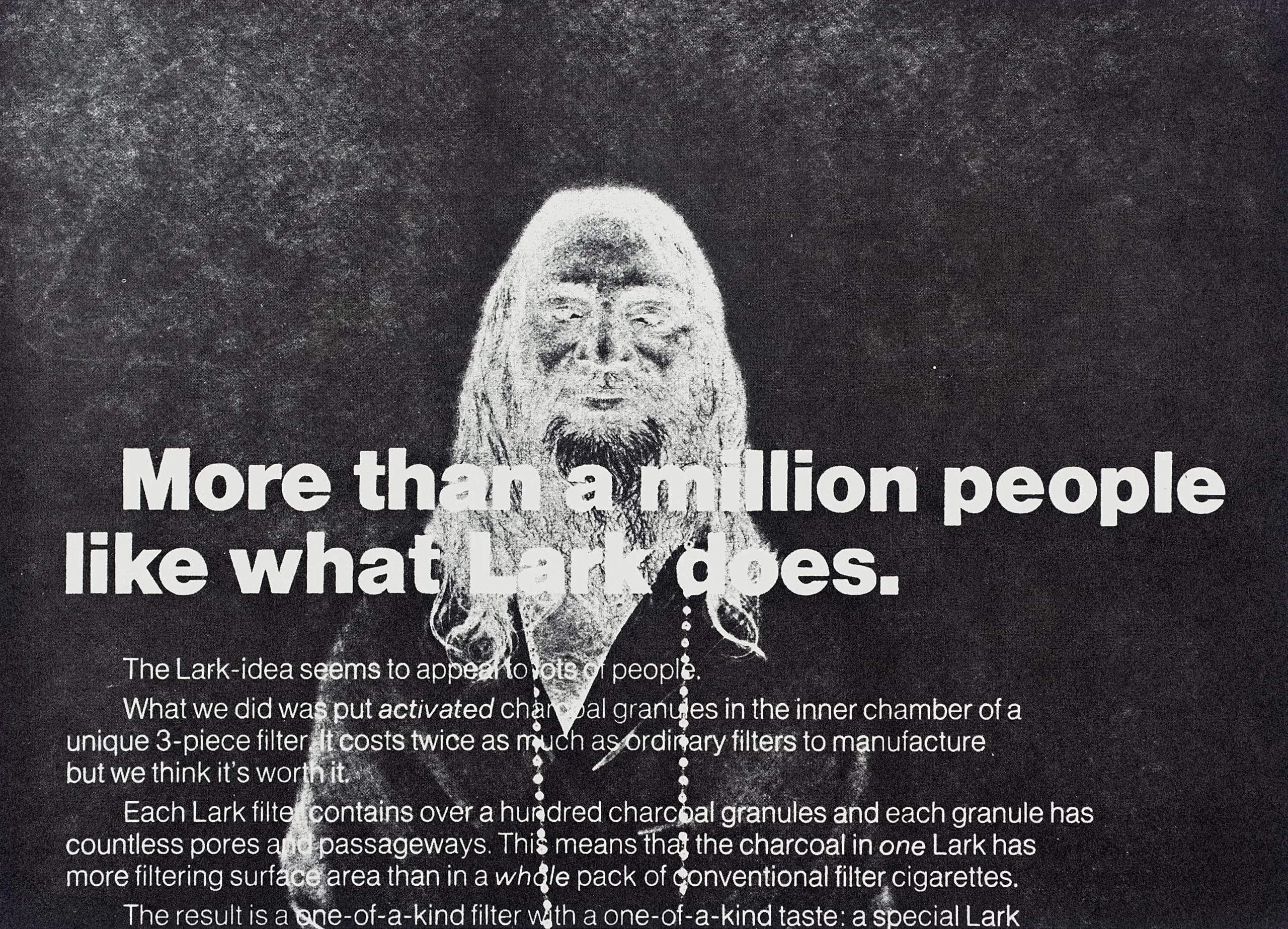 Print advertisement in white on black ground, with a soft-focus figure with long white hair and beard above bold headline text for Lark cigarettes