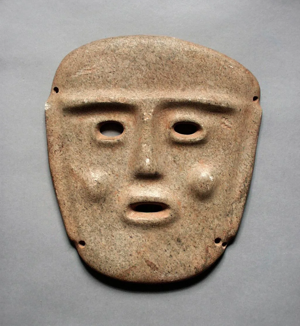Flat stone mask with low-relief facial features, two oval eye openings, a rectangular mouth slot, and four small attachment holes at the edges