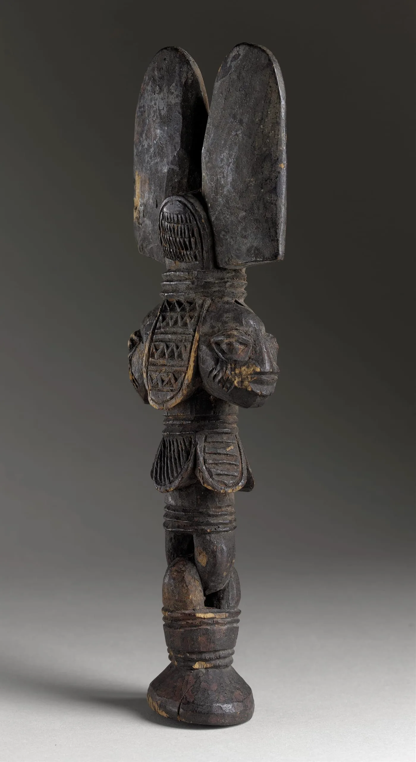 Carved wooden figure with dark patina, two large flat upright forms on the head, incised crosshatch patterning on face and arms, standing on a domed circular base