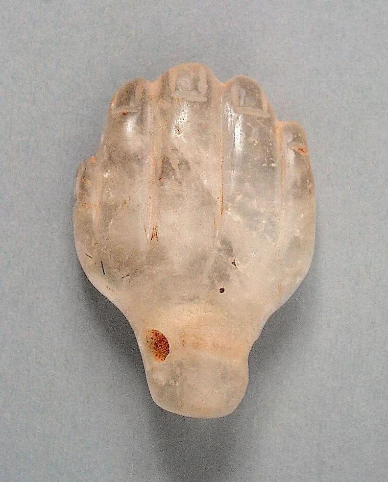 Small polished rock crystal or alabaster sculpture of a curled human hand with carved fingernails, translucent with rust-brown mineral inclusions