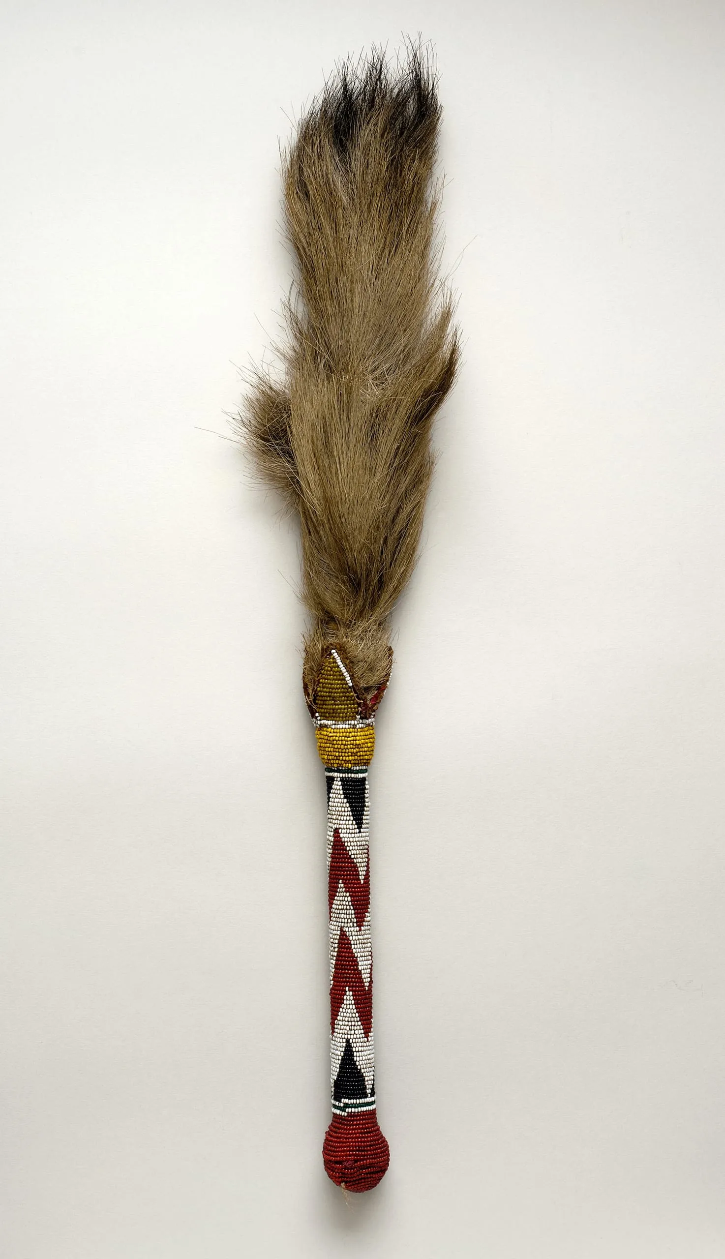 Beaded ceremonial handle with animal fur tuft, featuring a bold red, black, and white zigzag beadwork pattern along a cylindrical grip ending in a red beaded ball