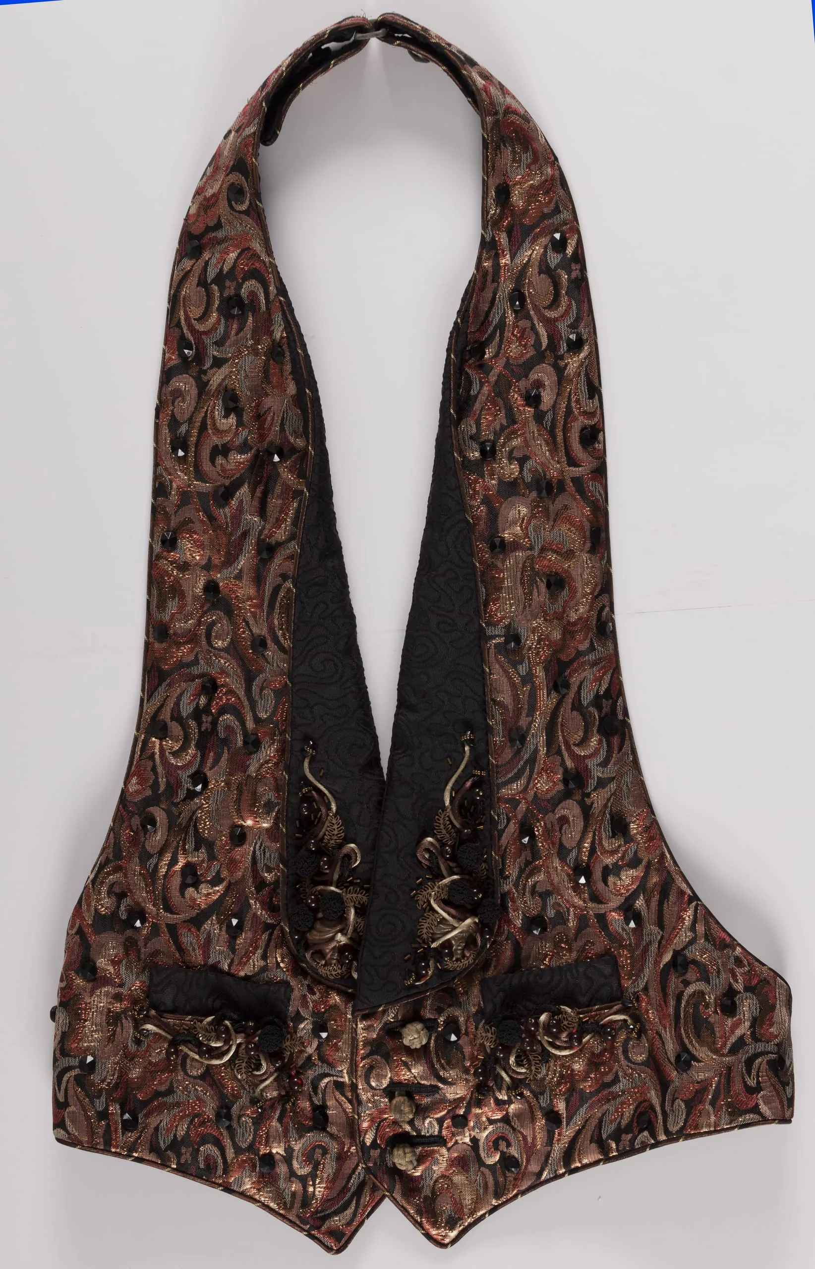 - Silk and metallic thread doublecloth with, glass beads, metal beads, silk cotrd, and silk thread covered buttons