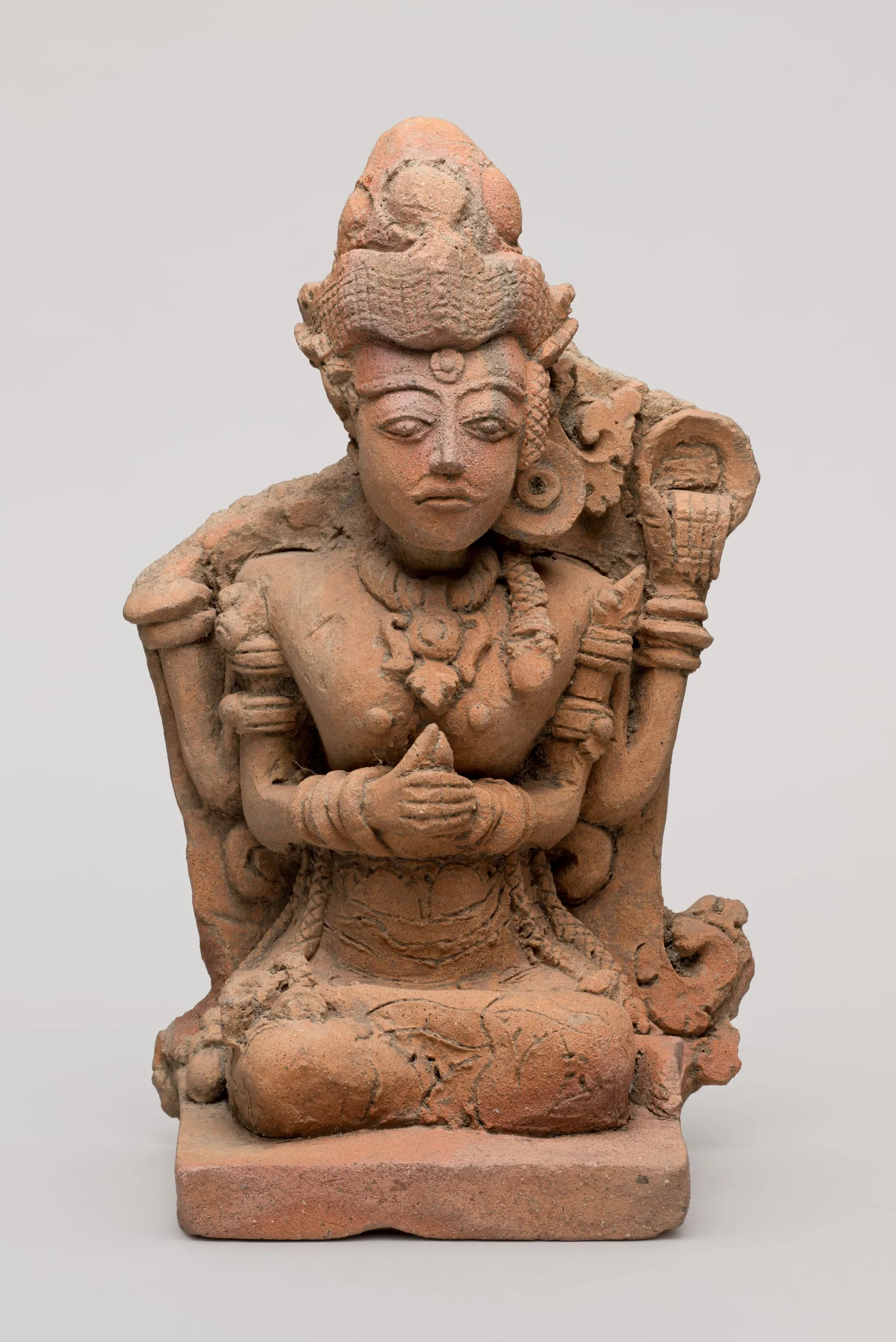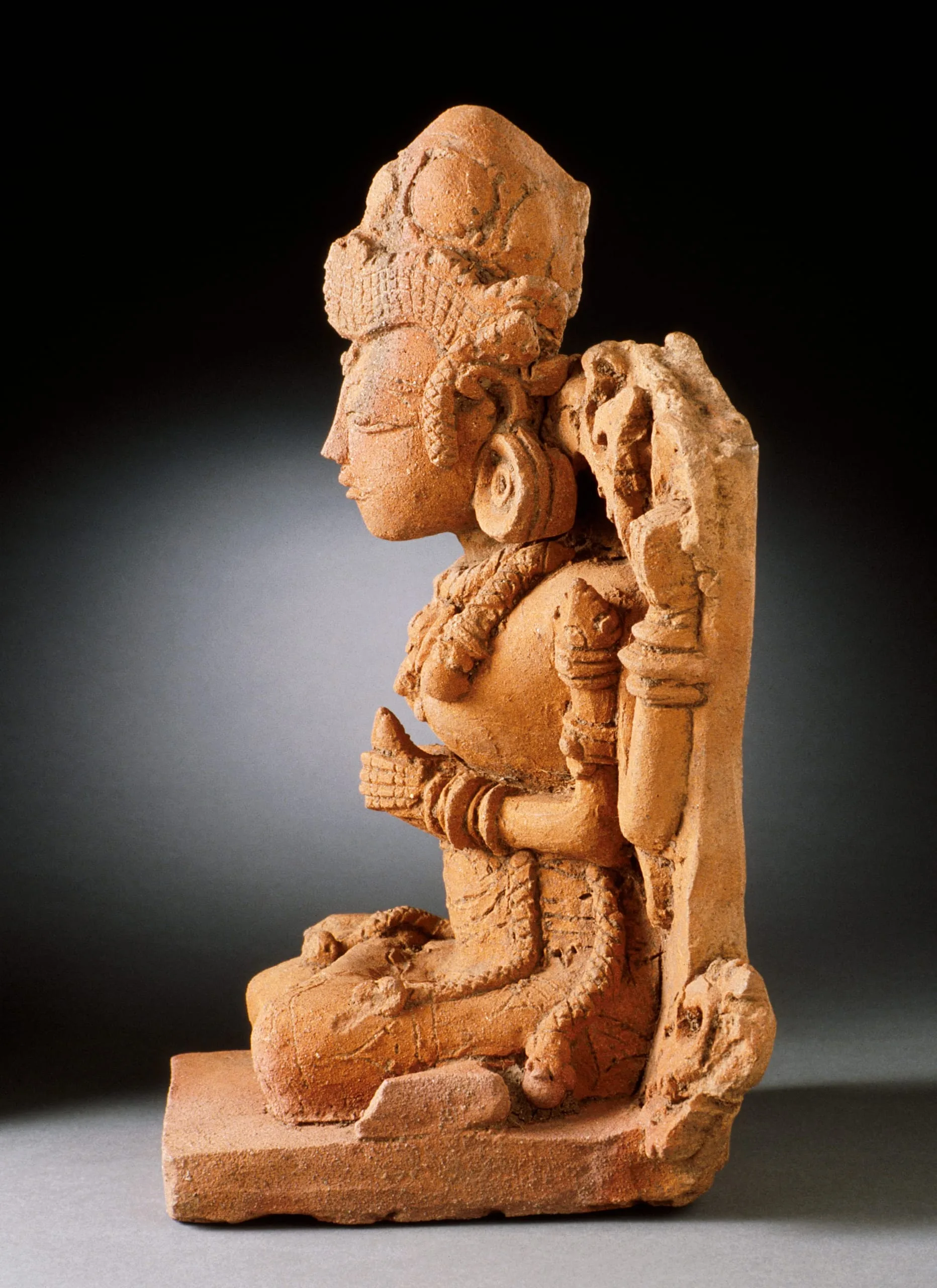 This earthenware sculpture has iconographic parallels with both the Hindu goddess Parvati, wife of Shiva, and the Buddhist goddess of wisdom Prajnaparamita. More likely, however, is that it is a memorial statue of a deified queen similar to M.81.273. The latter represents the development of a cult in which deceased royalty were believed to merge with a Supreme Divinity.